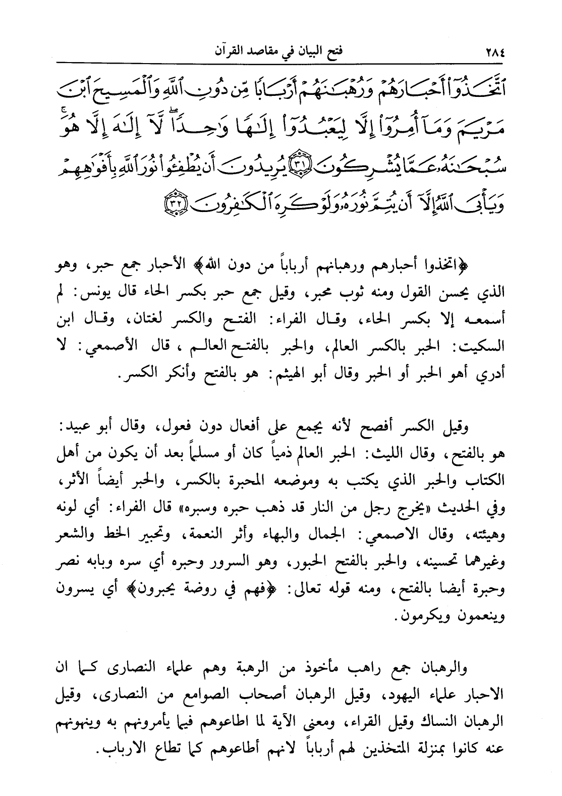 (اتخذوا أحبارهم ورهبانهم أرباباً من دون الله) الأحبار جمع حبر، وهو الذي يحسن القول ومنه ثوب محبر، وقيل جمع حبر بكسر الحاء قال يونس: لم أسمعه إلا بكسر الحاء، وقال الفراء: الفتح والكسر لغتان، وقال ابن السكيت: الحبر بالكسر العالم، والحبر بالفتح العالم، قال الأصمعي: لا أدري أهو الحبر أو الحبر وقال أبو الهيثم: هو بالفتح وأنكر الكسر.