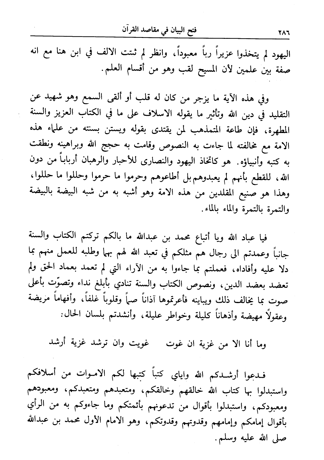 فيا عباد الله ويا أتباع محمد بن عبد الله ما بالكم تركتم الكتاب والسنة جانباً وعمدتم إلى رجال هم مثلكم في تعبد الله لهم بهما وطلبه للعمل منهم بما دلا عليه وأفاداه، فعملتم بما جاءوا به من الآراء التي لم تعمد بعماد الحق ولم تعضد بعضد الدين، ونصوص الكتاب والسنة تنادي بأبلغ نداء وتصوّت بأعلى صوت بما يخالف ذلك ويباينه فأعرتموها آذاناً صماً وقلوباً غلفاً، وأفهاماً مريضة وعقولاً مهيضة وأذهاناً كليلة وخواطر عليلة، وأنشدتم بلسان الحال: