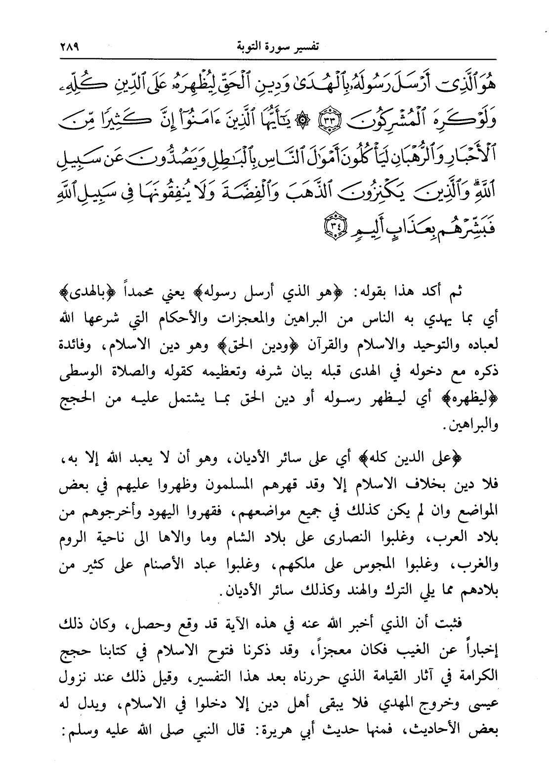 هُوَ الَّذِي أَرْسَلَ رَسُولَهُ بِالْهُدَى وَدِينِ الْحَقِّ لِيُظْهِرَهُ عَلَى الدِّينِ كُلِّهِ وَلَوْ كَرِهَ الْمُشْرِكُونَ (33) يَا أَيُّهَا الَّذِينَ آمَنُوا إِنَّ كَثِيرًا مِنَ الْأَحْبَارِ وَالرُّهْبَانِ لَيَأْكُلُونَ أَمْوَالَ النَّاسِ بِالْبَاطِلِ وَيَصُدُّونَ عَنْ سَبِيلِ اللَّهِ وَالَّذِينَ يَكْنِزُونَ الذَّهَبَ وَالْفِضَّةَ وَلَا يُنْفِقُونَهَا فِي سَبِيلِ اللَّهِ فَبَشِّرْهُمْ بِعَذَابٍ أَلِيمٍ