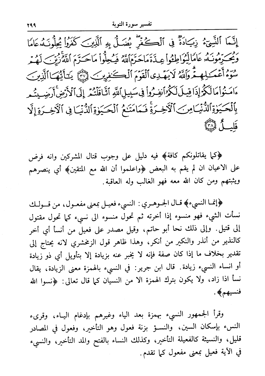 إِنَّمَا النَّسِيءُ زِيَادَةٌ فِي الْكُفْرِ يُضَلُّ بِهِ الَّذِينَ كَفَرُوا يُحِلُّونَهُ عَامًا وَيُحَرِّمُونَهُ عَامًا لِيُوَاطِئُوا عِدَّةَ مَا حَرَّمَ اللَّهُ فَيُحِلُّوا مَا حَرَّمَ اللَّهُ زُيِّنَ لَهُمْ سُوءُ أَعْمَالِهِمْ وَاللَّهُ لَا يَهْدِي الْقَوْمَ الْكَافِرِينَ (37) يَا أَيُّهَا الَّذِينَ آمَنُوا مَا لَكُمْ إِذَا قِيلَ لَكُمُ انْفِرُوا فِي سَبِيلِ اللَّهِ اثَّاقَلْتُمْ إِلَى الْأَرْضِ أَرَضِيتُمْ بِالْحَيَاةِ الدُّنْيَا مِنَ الْآخِرَةِ فَمَا مَتَاعُ الْحَيَاةِ الدُّنْيَا فِي الْآخِرَةِ إِلَّا قَلِيلٌ