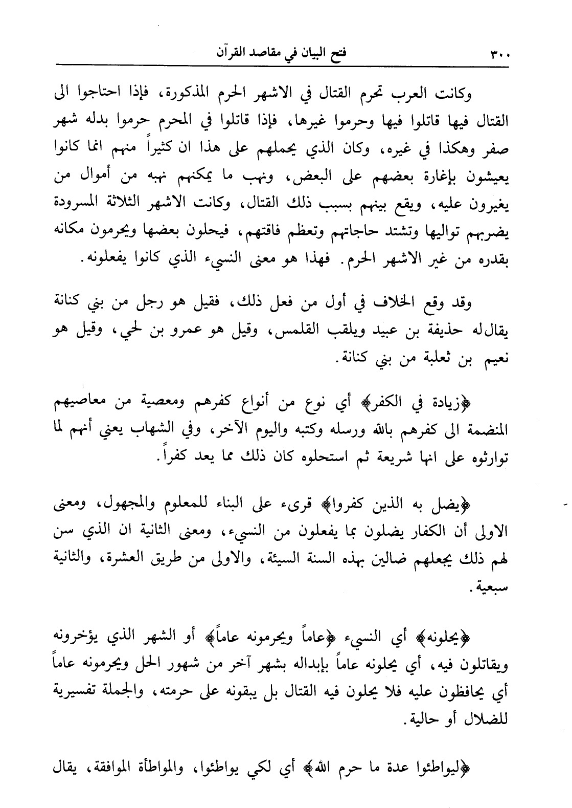 وكانت العرب تحرم القتال في الأشهر الحرم المذكورة، فإذا احتاجوا إلى القتال فيها قاتلوا فيها وحرموا غيرها، فإذا قاتلوا في المحرم حرموا بدله شهر صفر وهكذا في غيره، وكان الذي يحملهم على هذا أن كثيراً منهم إنما كانوا يعيشون بإغارة بعضهم على البعض، ونهب ما يمكنهم نهبه من أموال من يغيرون عليه، ويقع بينهم بسبب ذلك القتال، وكانت الأشهر الثلاثة المسرودة يضربهم تواليها وتشتد حاجاتهم وتعظم فاقتهم، فيحلون بعضها ويحرمون مكانه بقدره من غير الأشهر الحرم. فهذا هو معنى النسيء الذي كانوا يفعلونه.