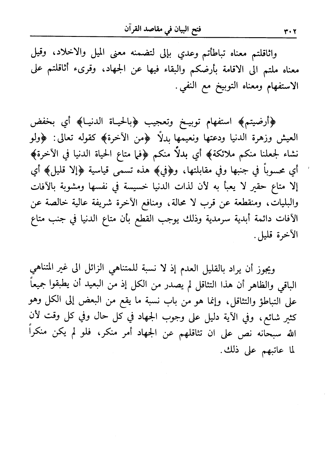 ويجوز أن يراد بالقليل العدم إذ لا نسبة للمتناهي الزائل إلى غير المتناهي الباقي والظاهر أن هذا التثاقل لم يصدر من الكل إذ من البعيد أن يطبقوا جمعاً على التباطؤ والتثاقل، وإنما هو من باب نسبة ما يقع من البعض إلى الكل وهو كثير شائع، وفي الآية دليل على وجوب الجهاد في كل حال وفي كل وقت لأن الله سبحانه نص على أن تثاقلهم عَن الجهاد أمر منكر، فلو لم يكن منكراً لما عاتبهم على ذلك.