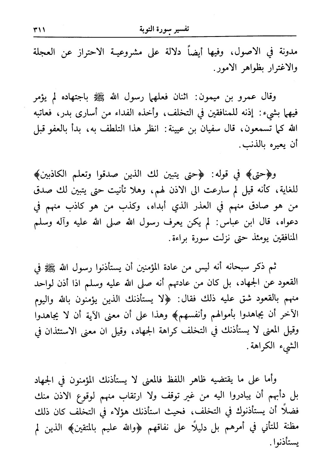وقال عمرو بن ميمون: اثنان فعلهما رسول الله - صلى الله عليه وسلم - باجتهاده لم يؤمر فيهما بشيء: إذنه للمنافقين في التخلف، وأخذه الفداء من أسارى بدر، فعاتبه الله كما تسمعون، قال سفيان بن عيينة: انظر هذا التلطف به، بدأ بالعفو قبل أن يعيره بالذنب.
