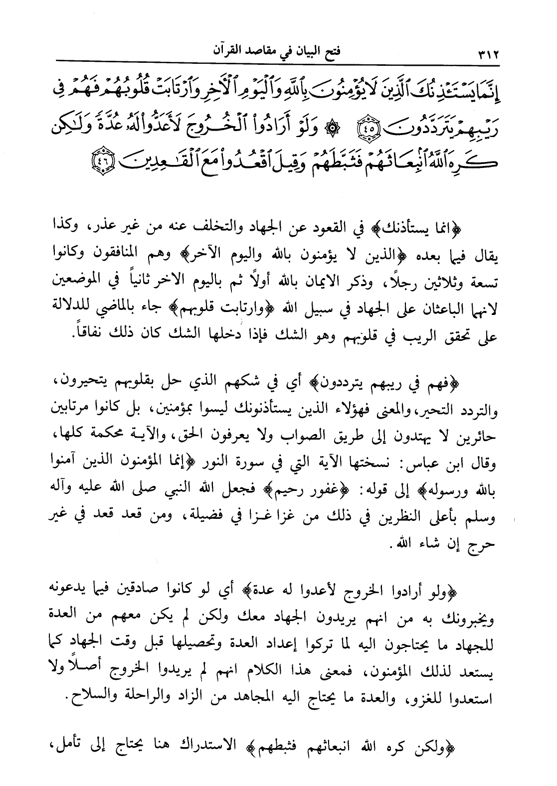 إِنَّمَا يَسْتَأْذِنُكَ الَّذِينَ لَا يُؤْمِنُونَ بِاللَّهِ وَالْيَوْمِ الْآخِرِ وَارْتَابَتْ قُلُوبُهُمْ فَهُمْ فِي رَيْبِهِمْ يَتَرَدَّدُونَ 45) وَلَوْ أَرَادُوا الْخُرُوجَ لَأَعَدُّوا لَهُ عُدَّةً وَلَكِنْ كَرِهَ اللَّهُ انْبِعَاثَهُمْ فَثَبَّطَهُمْ وَقِيلَ اقْعُدُوا مَعَ الْقَاعِدِينَ