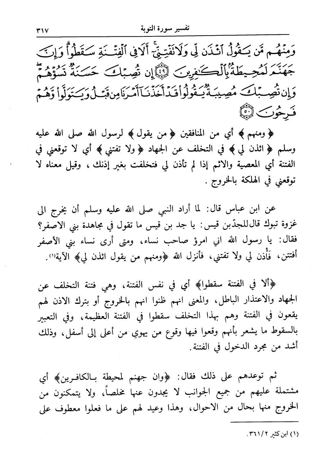 وَمِنْهُمْ مَنْ يَقُولُ ائْذَنْ لِي وَلَا تَفْتِنِّي أَلَا فِي الْفِتْنَةِ سَقَطُوا وَإِنَّ جَهَنَّمَ لَمُحِيطَةٌ بِالْكَافِرِينَ (49) إِنْ تُصِبْكَ حَسَنَةٌ تَسُؤْهُمْ وَإِنْ تُصِبْكَ مُصِيبَةٌ يَقُولُوا قَدْ أَخَذْنَا أَمْرَنَا مِنْ قَبْلُ وَيَتَوَلَّوْا وَهُمْ فَرِحُونَ