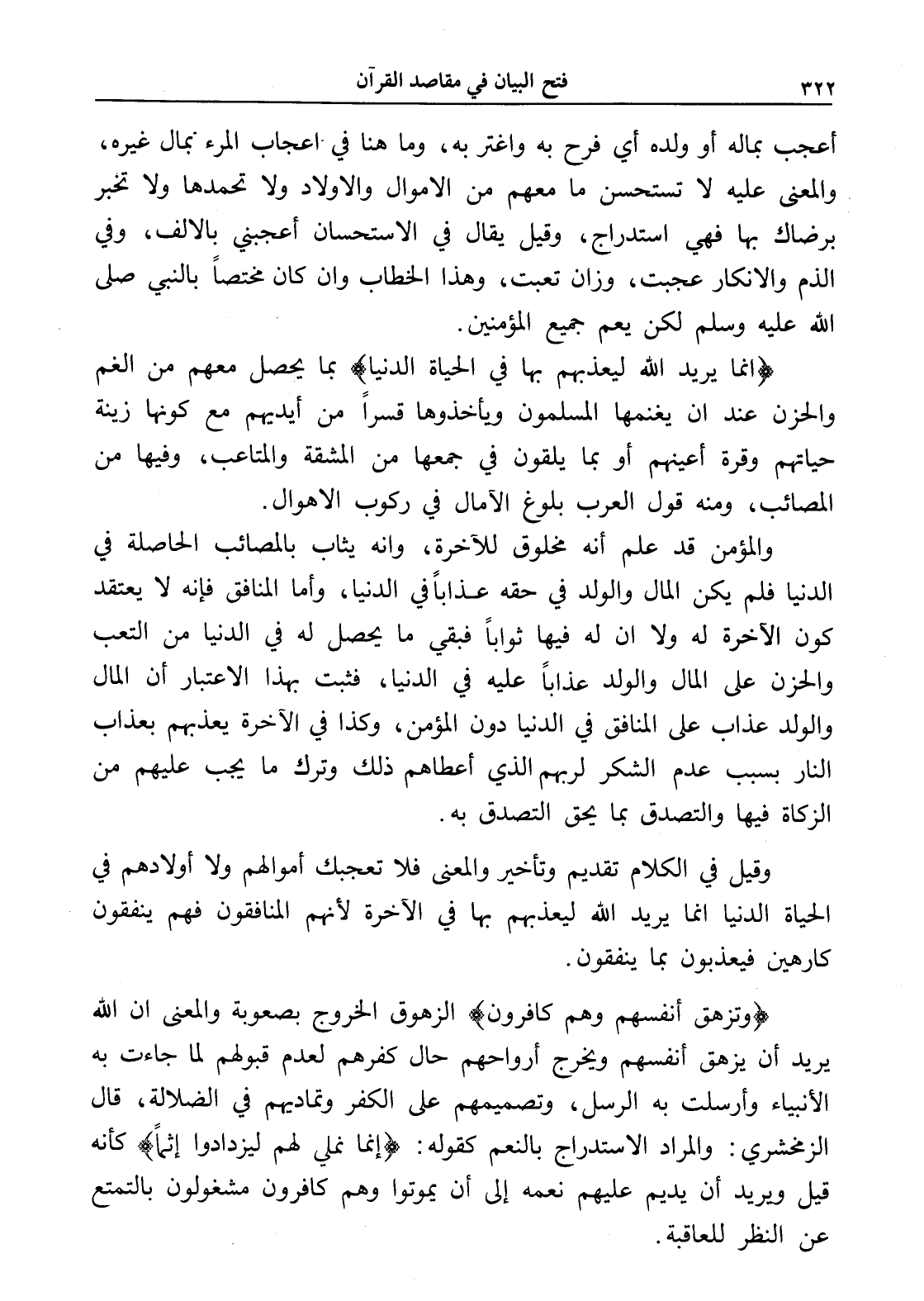 (إنما يريد الله ليعذبهم بها في الحياة الدنيا) بما يحصل معهم من الغم والحزن عند أن يغنمها المسلمون ويأخذوها قسراً من أيديهم مع كونها زينة حياتهم وقرة أعينهم أو بما يلقون في جمعها من المشقة والمتاعب، وفيها من المصائب، ومنه قول العرب بلوغ الآمال في ركوب الأهوال.