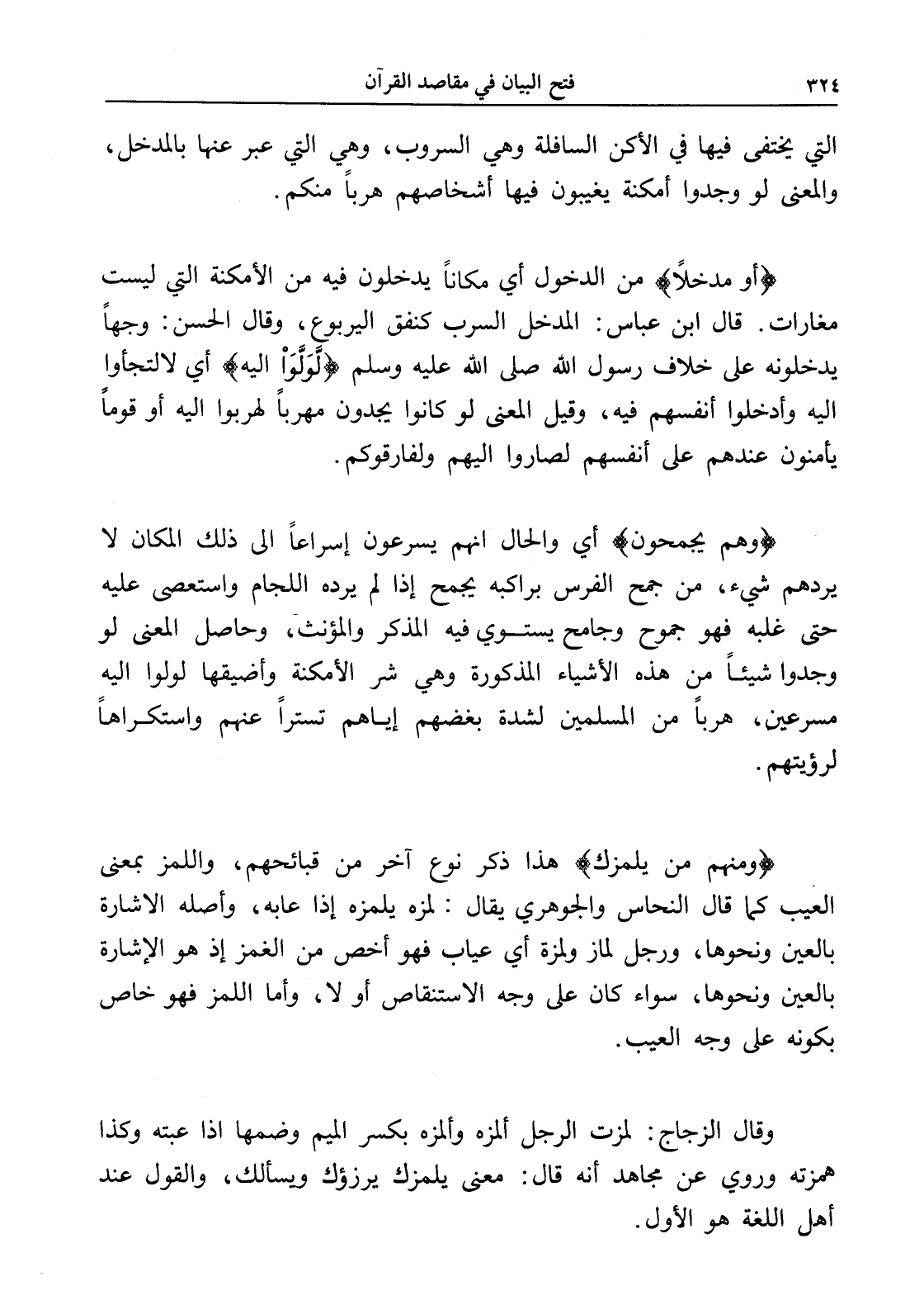 (أو مدخلاً) من الدخول أي مكاناً يدخلون فيه من الأمكنة التي ليست مغارات. قال ابن عباس: المدخل السرب كنفق اليربوع، وقال الحسن: وجهاً يدخلونه على خلاف رسول الله صلى الله عليه وسلم (لوَلَّوَاْ إليه) أي لالتجأوا إليه وأدخلوا أنفسهم فيه، وقيل المعنى لو كانوا يجدون مهرباً لهربوا إليه أو قوماً يأمنون عندهم على أنفسهم لصاروا إليهم ولفارقوكم.
