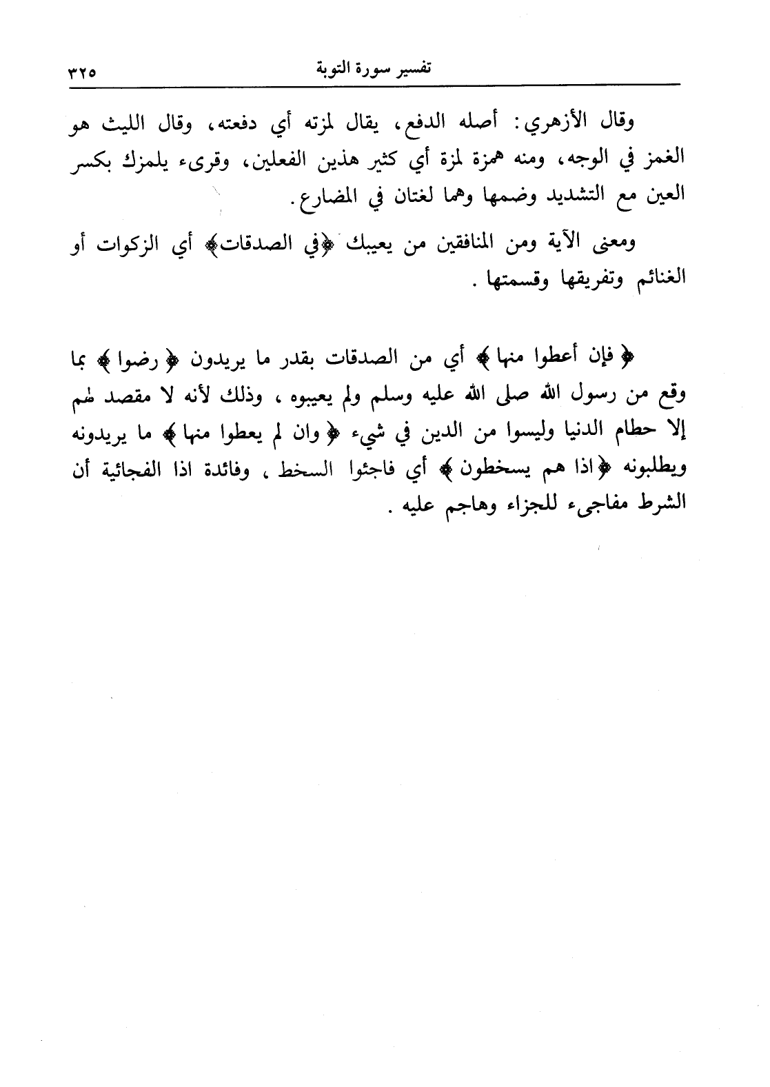 ومعنى الآية ومن المنافقين من يعيبك (في الصدقات) أي الزكوات أو الغنائم وتفريقها وقسمتها.