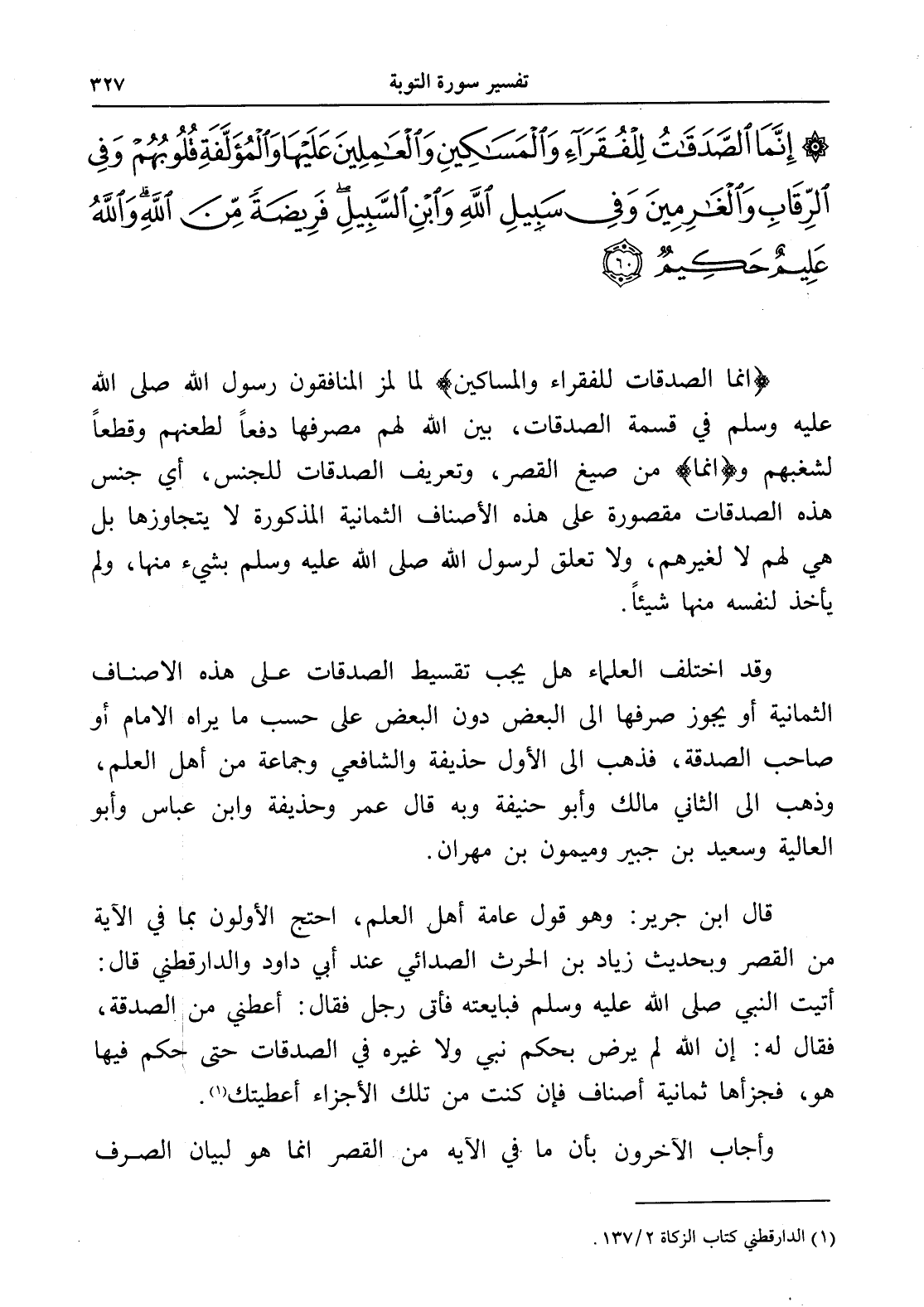 إِنَّمَا الصَّدَقَاتُ لِلْفُقَرَاءِ وَالْمَسَاكِينِ وَالْعَامِلِينَ عَلَيْهَا وَالْمُؤَلَّفَةِ قُلُوبُهُمْ وَفِي الرِّقَابِ وَالْغَارِمِينَ وَفِي سَبِيلِ اللَّهِ وَابْنِ السَّبِيلِ فَرِيضَةً مِنَ اللَّهِ وَاللَّهُ عَلِيمٌ حَكِيمٌ