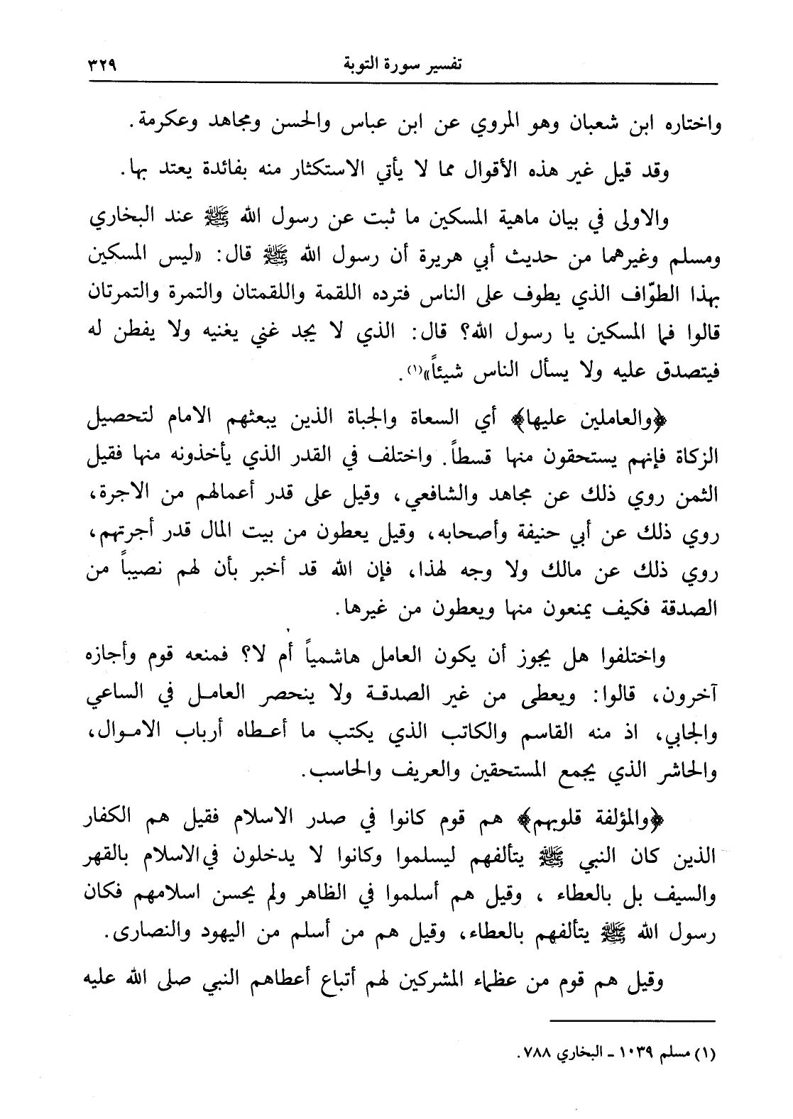 (والعاملين عليها) أي السعاة والجباة الذين يبعثهم الإمام لتحصيل الزكاة فإنهم يستحقون منها قسطاً. واختلف في القدر الذي يأخذونه منها فقيل الثمن روي ذلك عن مجاهد والشافعي، وقيل على قدر أعمالهم من الأجرة، روي ذلك عن أبي حنيفة وأصحابه، وقيل يعطون من بيت المال قدر أجرتهم، روي ذلك عن مالك ولا وجه لهذا، فإن الله قد أخبر بأن لهم نصيباً من الصدقة فكيف يمنعون منها ويعطون من غيرها.