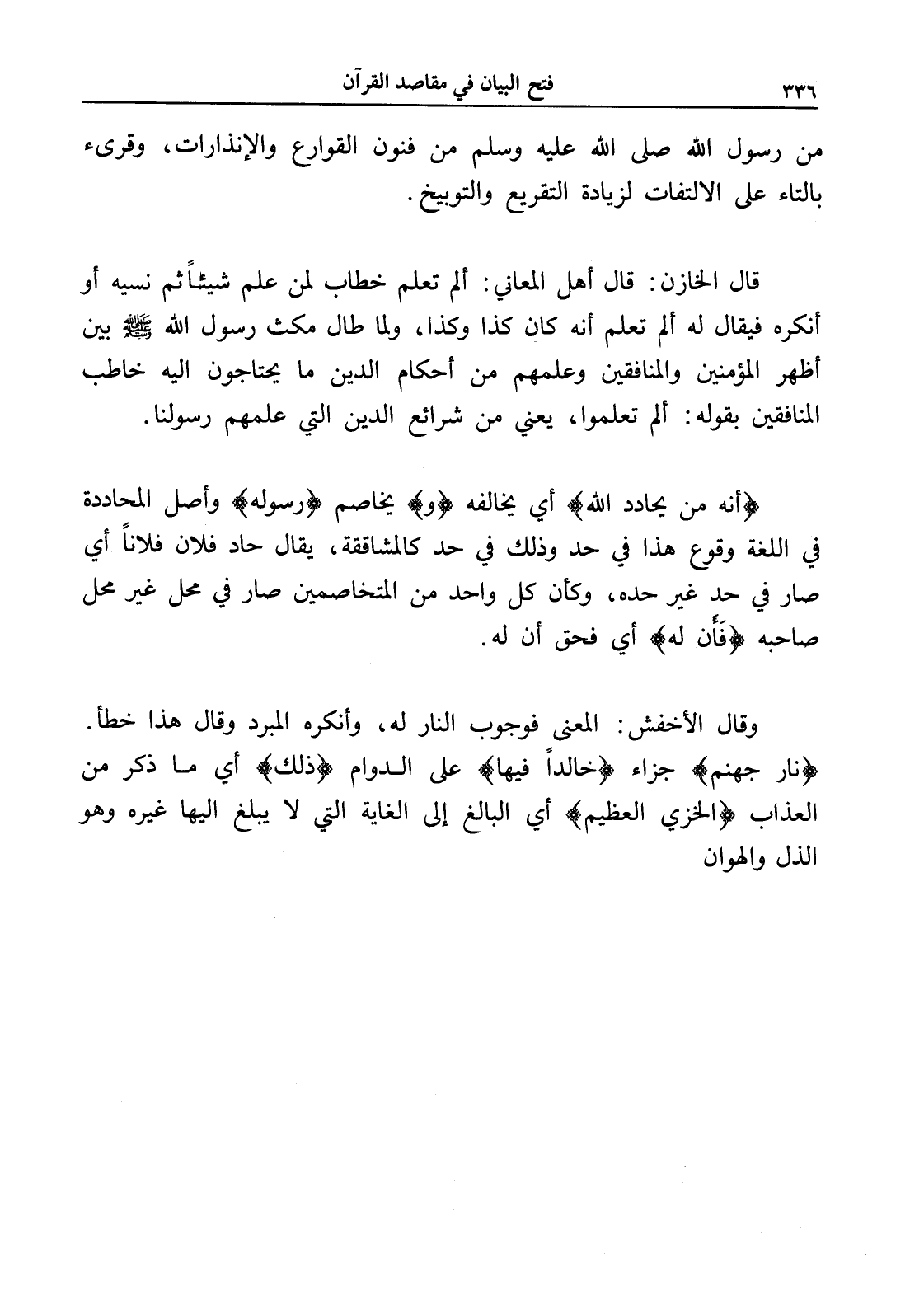 (أنه من يحادد الله) أي يخالفه (و) يخاصم (رسوله) وأصل المحاددة في اللغة وقوع هذا في حد وذلك في حد كالمشاققة، يقال حاد فلان فلاناً أي صار في حد غير حده، وكأن كل واحد من المتخاصمين صار في محل غير محل صاحبه (فَأن له) أي فحق أن له.