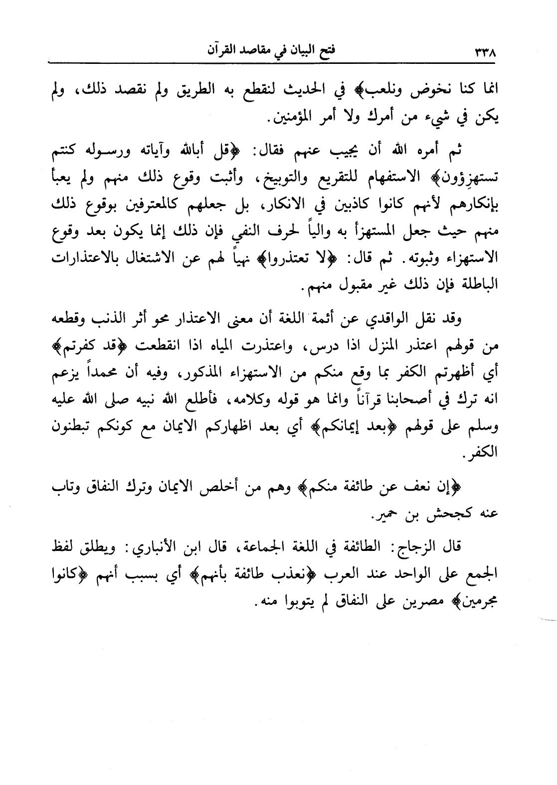 وقد نقل الواقدي عن أئمة اللغة أن معنى الاعتذار محو أثر الذنب وقطعه من قولهم اعتذر المنزل إذا درس، واعتذرت المياه إذا انقطعت (قد كفرتم) أي أظهرتم الكفر بما وقع منكم من الاستهزاء المذكور، وفيه أن محمداً يزعم أنه ترك في أصحابنا قرآناً وإنما هو قوله وكلامه، فأطلع الله نبيه صلى الله عليه وسلم على قولهم (بعد إيمانكم) أي بعد إظهاركم الإيمان مع كونكم تبطنون الكفر.