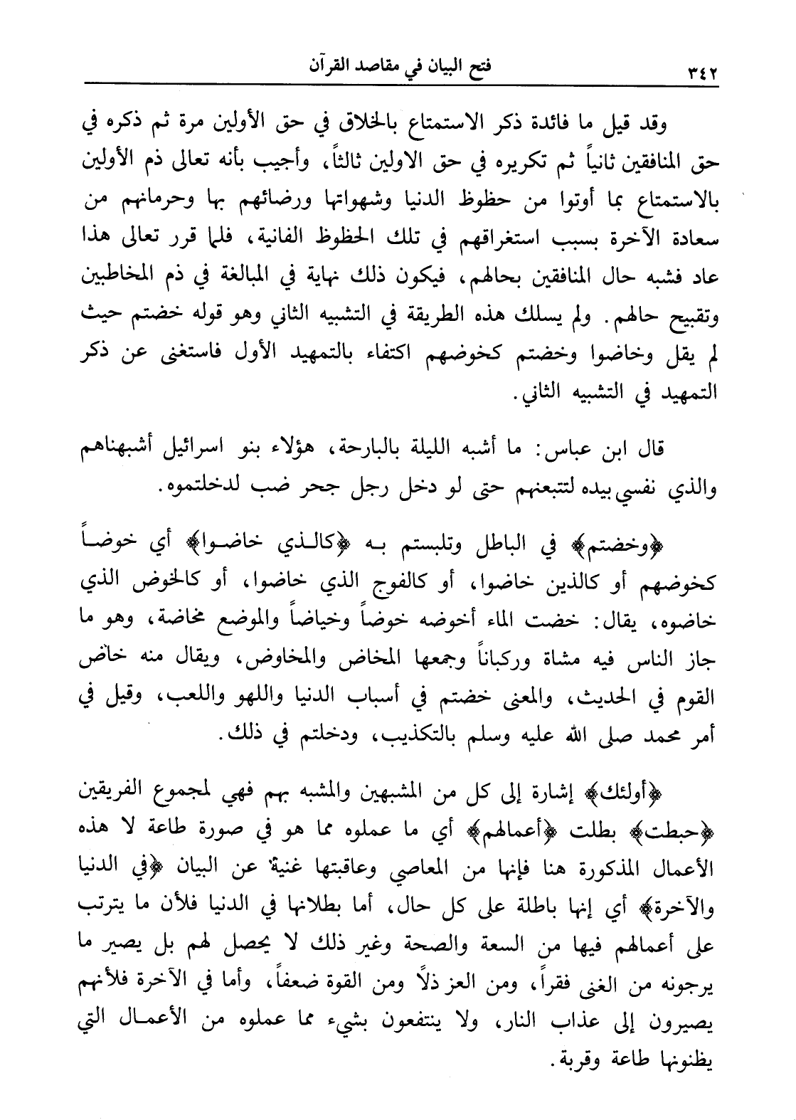 وقد قيل ما فائدة ذكر الاستمتاع بالخلاق في حق الأولين مرة ثم ذكره في حق المنافقين ثانياً ثم تكريره في حق الأولين ثالثاً، وأجيب بأنه تعالى ذم الأولين بالاستمتاع بما أوتوا من حظوظ الدنيا وشهواتها ورضائهم بها وحرمانهم من سعادة الآخرة بسبب استغراقهم في تلك الحظوظ الفانية، فلما قرر تعالى هذا عاد فشبه حال المنافقين بحالهم، فيكون ذلك نهاية في المبالغة في ذم المخاطبين وتقبيح حالهم. ولم يسلك هذه الطريقة في التشبيه الثاني وهو قوله خضتم حيث لم يقل وخاضوا وخضتم كخوضهم اكتفاء بالتمهيد الأول فاستغنى عن ذكر التمهيد في التشبيه الثاني.