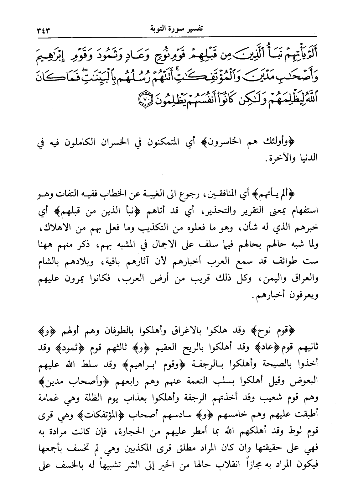 أَلَمْ يَأْتِهِمْ نَبَأُ الَّذِينَ مِنْ قَبْلِهِمْ قَوْمِ نُوحٍ وَعَادٍ وَثَمُودَ وَقَوْمِ إِبْرَاهِيمَ وَأَصْحَابِ مَدْيَنَ وَالْمُؤْتَفِكَاتِ أَتَتْهُمْ رُسُلُهُمْ بِالْبَيِّنَاتِ فَمَا كَانَ اللَّهُ لِيَظْلِمَهُمْ وَلَكِنْ كَانُوا أَنْفُسَهُمْ يَظْلِمُونَ