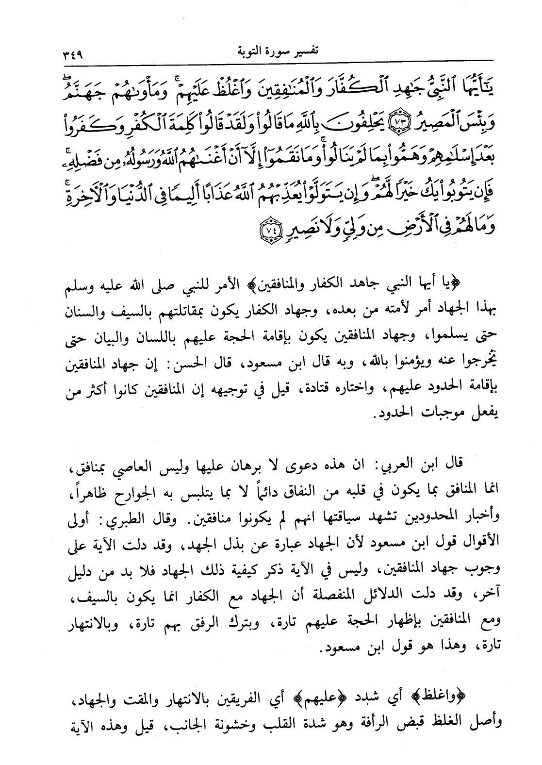 يَا أَيُّهَا النَّبِيُّ جَاهِدِ الْكُفَّارَ وَالْمُنَافِقِينَ وَاغْلُظْ عَلَيْهِمْ وَمَأْوَاهُمْ جَهَنَّمُ وَبِئْسَ الْمَصِيرُ (73) يَحْلِفُونَ بِاللَّهِ مَا قَالُوا وَلَقَدْ قَالُوا كَلِمَةَ الْكُفْرِ وَكَفَرُوا بَعْدَ إِسْلَامِهِمْ وَهَمُّوا بِمَا لَمْ يَنَالُوا وَمَا نَقَمُوا إِلَّا أَنْ أَغْنَاهُمُ اللَّهُ وَرَسُولُهُ مِنْ فَضْلِهِ فَإِنْ يَتُوبُوا يَكُ خَيْرًا لَهُمْ وَإِنْ يَتَوَلَّوْا يُعَذِّبْهُمُ اللَّهُ عَذَابًا أَلِيمًا فِي الدُّنْيَا وَالْآخِرَةِ وَمَا لَهُمْ فِي الْأَرْضِ مِنْ وَلِيٍّ وَلَا نَصِيرٍ