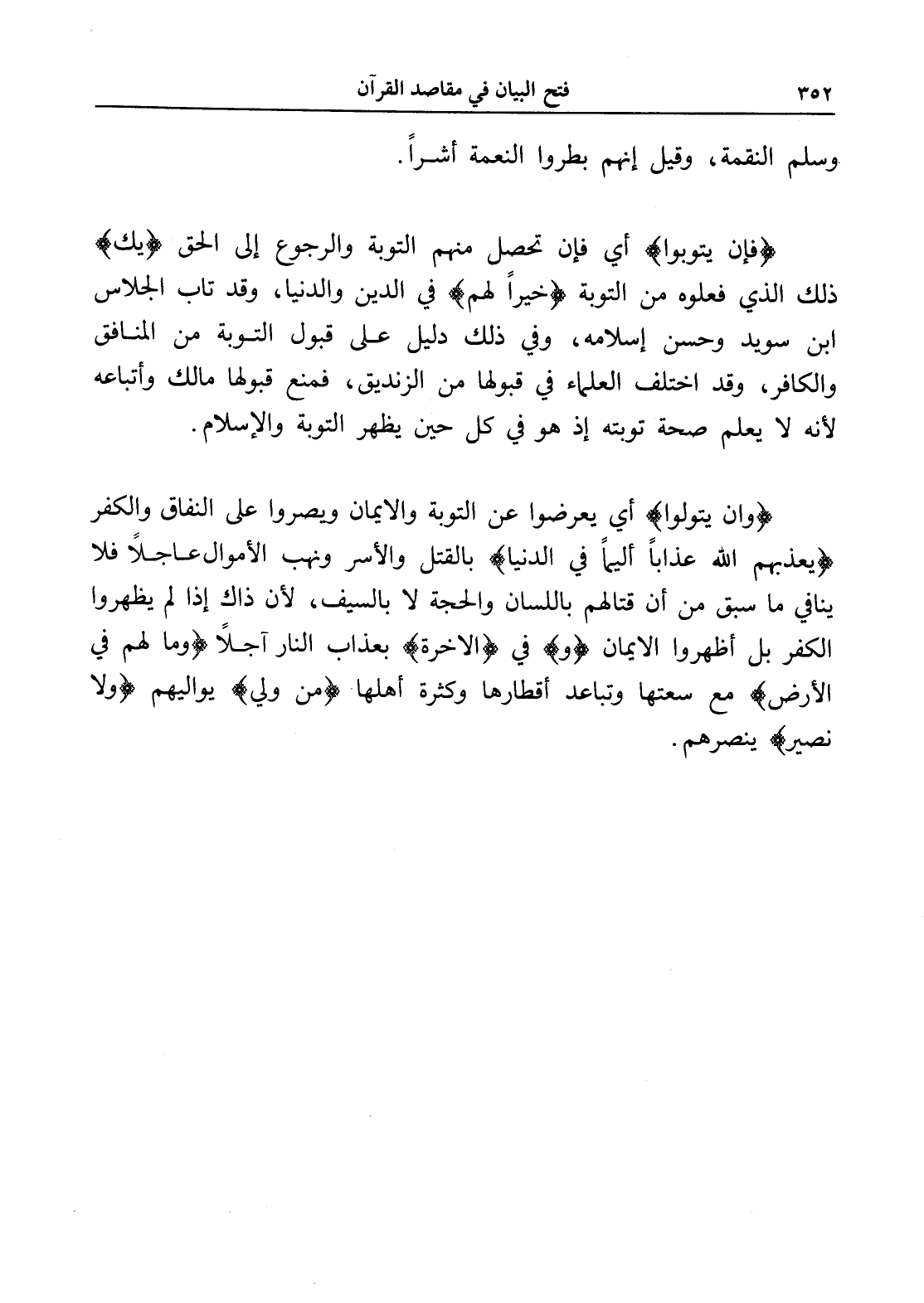 (فإن يتوبوا) أي فإن تحصل منهم التوبة والرجوع إلى الحق (يك) ذلك الذي فعلوه من التوبة (خيراً لهم) في الدين والدنيا، وقد تاب الجلاس ابن سويد وحسن إسلامه، وفي ذلك دليل على قبول التوبة من المنافق والكافر، وقد اختلف العلماء في قبولها من الزنديق، فمنع قبولها مالك وأتباعه لأنه لا يعلم صحة توبته إذ هو في كل حين يظهر التوبة والإسلام.