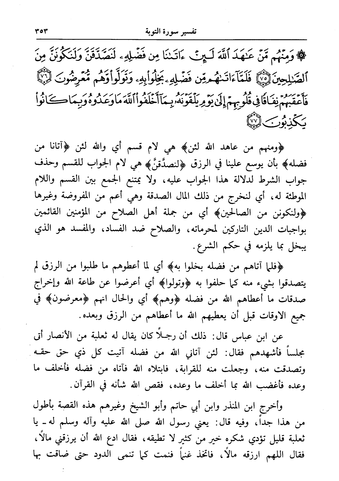 وَمِنْهُمْ مَنْ عَاهَدَ اللَّهَ لَئِنْ آتَانَا مِنْ فَضْلِهِ لَنَصَّدَّقَنَّ وَلَنَكُونَنَّ مِنَ الصَّالِحِينَ (75) فَلَمَّا آتَاهُمْ مِنْ فَضْلِهِ بَخِلُوا بِهِ وَتَوَلَّوْا وَهُمْ مُعْرِضُونَ (76) فَأَعْقَبَهُمْ نِفَاقًا فِي قُلُوبِهِمْ إِلَى يَوْمِ يَلْقَوْنَهُ بِمَا أَخْلَفُوا اللَّهَ مَا وَعَدُوهُ وَبِمَا كَانُوا يَكْذِبُونَ