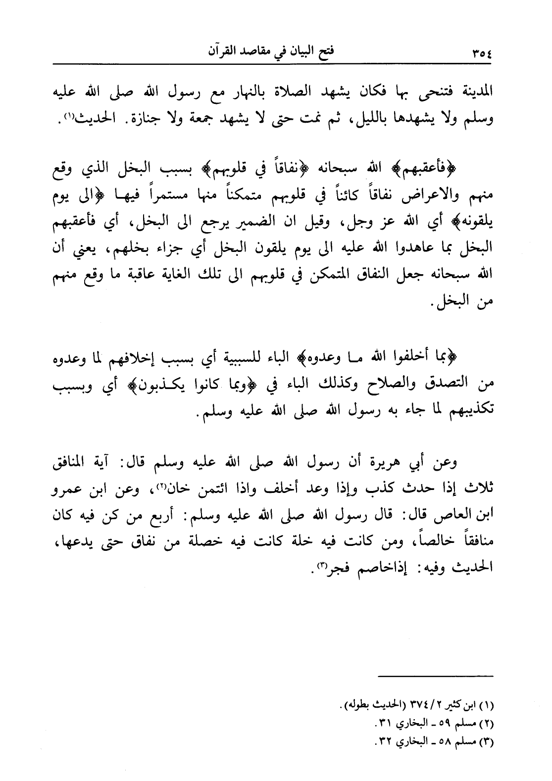 (فأعقبهم) الله سبحانه (نفاقاً في قلوبهم) بسبب البخل الذي وقع منهم والإعراض نفاقاً كائناً في قلوبهم متمكناً منها مستمراً فيها (إلى يوم يلقونه) أي الله عز وجل، وقيل أن الضمير يرجع إلى البخل، أي فأعقبهم البخل بما عاهدوا الله عليه إلى يوم يلقون البخل أي جزاء بخلهم، يعني أن الله سبحانه جعل النفاق المتمكن في قلوبهم إلى تلك الغاية عاقبة ما وقع منهم من البخل.