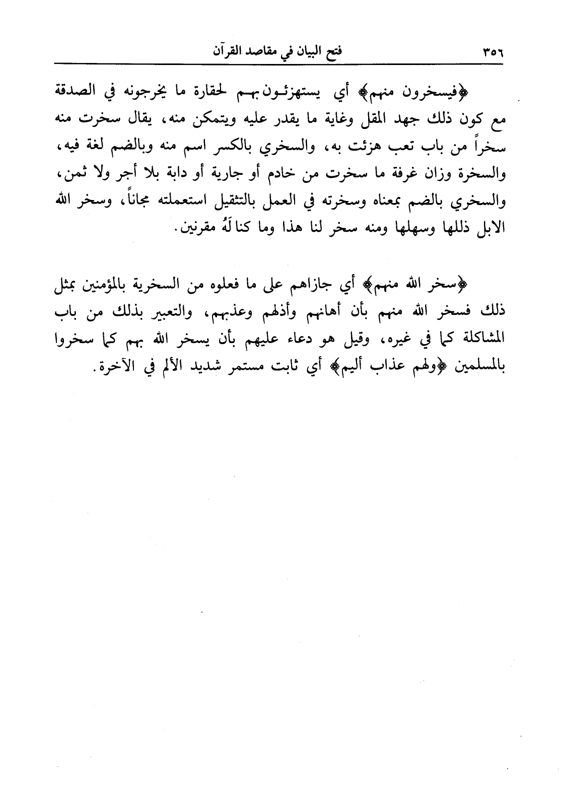 (فيسخرون منهم) أي يستهزئون بهم لحقارة ما يخرجونه في الصدقة مع كون ذلك جهد المقل وغاية ما يقدر عليه ويتمكن منه، يقال سخرت منه سخراً من باب تعب هزئت به، والسخري بالكسر اسم منه وبالضم لغة فيه، والسخرة وزان غرفة ما سخرت من خادم أو جارية أو دابة بلا أجر ولا ثمن، والسخري بالضم بمعناه وسخرته في العمل بالتثقيل استعملته مجاناً، وسخر الله الإبل ذللها وسهلها ومنه سخر لنا هذا وما كنا لَهُ مقرنين.