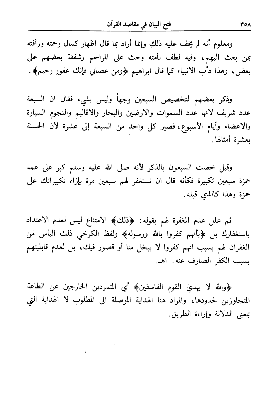 ثم علل عدم المغفرة لهم بقوله: (ذلك) الامتناع ليس لعدم الاعتداد باستغفارك بل (بأنهم كفروا بالله ورسوله) ولفظ الكرخي ذلك اليأس من الغفران لهم بسبب أنهم كفروا لا ببخل منا أو قصور فيك، بل لعدم قابليتهم بسبب الكفر الصارف عنه. اهـ.