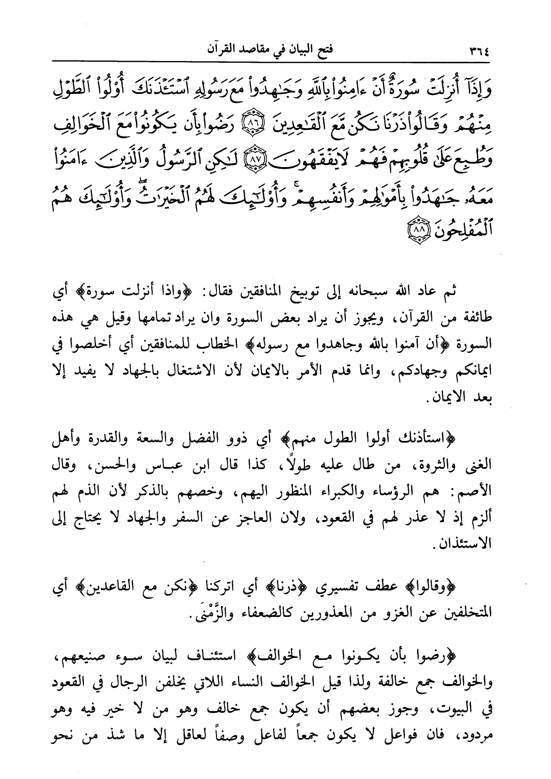 وَإِذَا أُنْزِلَتْ سُورَةٌ أَنْ آمِنُوا بِاللَّهِ وَجَاهِدُوا مَعَ رَسُولِهِ اسْتَأْذَنَكَ أُولُو الطَّوْلِ مِنْهُمْ وَقَالُوا ذَرْنَا نَكُنْ مَعَ الْقَاعِدِينَ (86) رَضُوا بِأَنْ يَكُونُوا مَعَ الْخَوَالِفِ وَطُبِعَ عَلَى قُلُوبِهِمْ فَهُمْ لَا يَفْقَهُونَ (87) لَكِنِ الرَّسُولُ وَالَّذِينَ آمَنُوا مَعَهُ جَاهَدُوا بِأَمْوَالِهِمْ وَأَنْفُسِهِمْ وَأُولَئِكَ لَهُمُ الْخَيْرَاتُ وَأُولَئِكَ هُمُ الْمُفْلِحُونَ