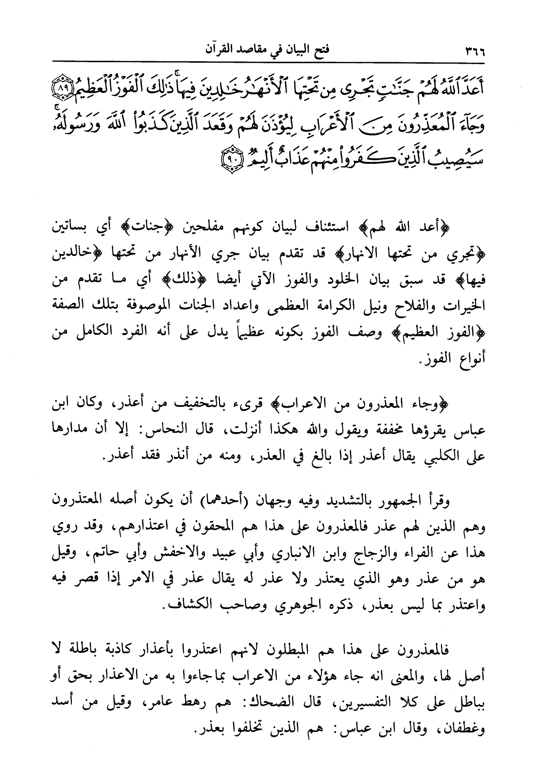 أَعَدَّ اللَّهُ لَهُمْ جَنَّاتٍ تَجْرِي مِنْ تَحْتِهَا الْأَنْهَارُ خَالِدِينَ فِيهَا ذَلِكَ الْفَوْزُ الْعَظِيمُ (89) وَجَاءَ الْمُعَذِّرُونَ مِنَ الْأَعْرَابِ لِيُؤْذَنَ لَهُمْ وَقَعَدَ الَّذِينَ كَذَبُوا اللَّهَ وَرَسُولَهُ سَيُصِيبُ الَّذِينَ كَفَرُوا مِنْهُمْ عَذَابٌ أَلِيمٌ