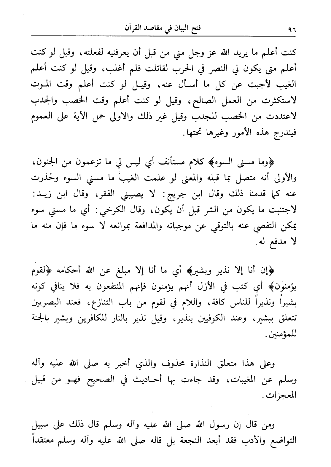وعلى هذا متعلق النذارة محذوف والذي أخبر به صلى الله عليه وآله وسلم عن المغيبات، وقد جاءت بها أحاديث في الصحيح فهو من قبيل المعجزات.