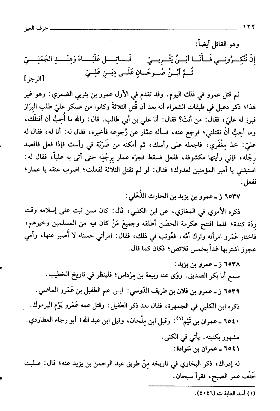 [الرجز] ثم قتل عمرو في ذلك اليوم. وقد تقدم في الأول عمرو بن يثربي الضمريّ: وهو غير هذا، ذكر دعبل في طبقات الشعراء أنه بعد أن قتل الثلاثة