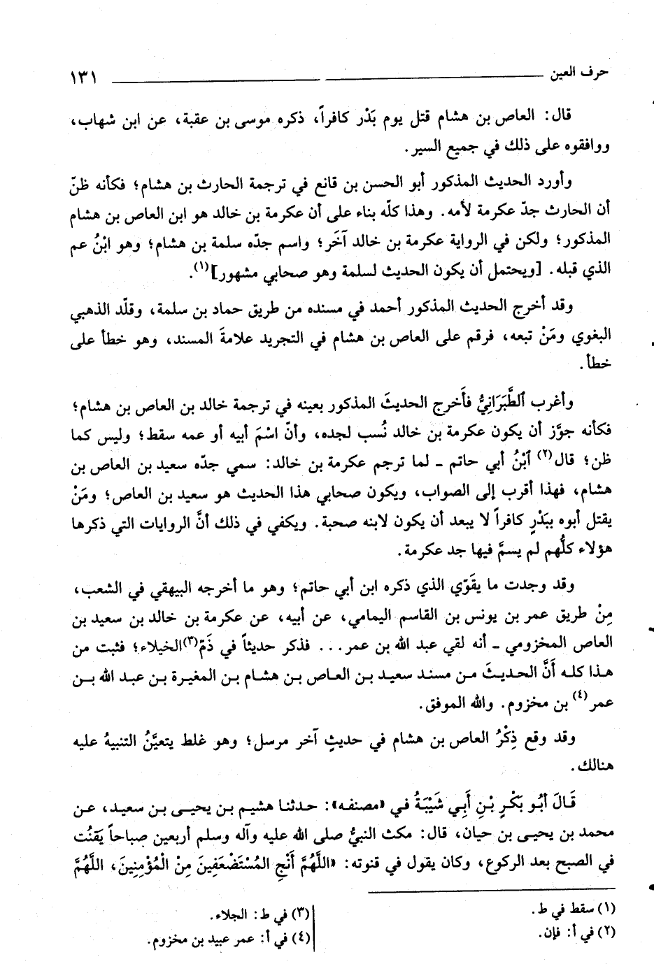 وأورد الحديث المذكور أبو الحسن بن قانع في ترجمة الحارث بن هشام، فكأنه ظنّ أن الحارث جدّ عكرمة لأمه. وهذا كلّه بناء على أن عكرمة بن خالد هو ابن العاص بن هشام المذكور، ولكن في الرواية عكرمة بن خالد آخر، واسم جدّه سلمة بن هشام، وهو ابن عم الّذي قبله. [ويحتمل أن يكون الحديث لسلمة وهو صحابي مشهور] «١» .