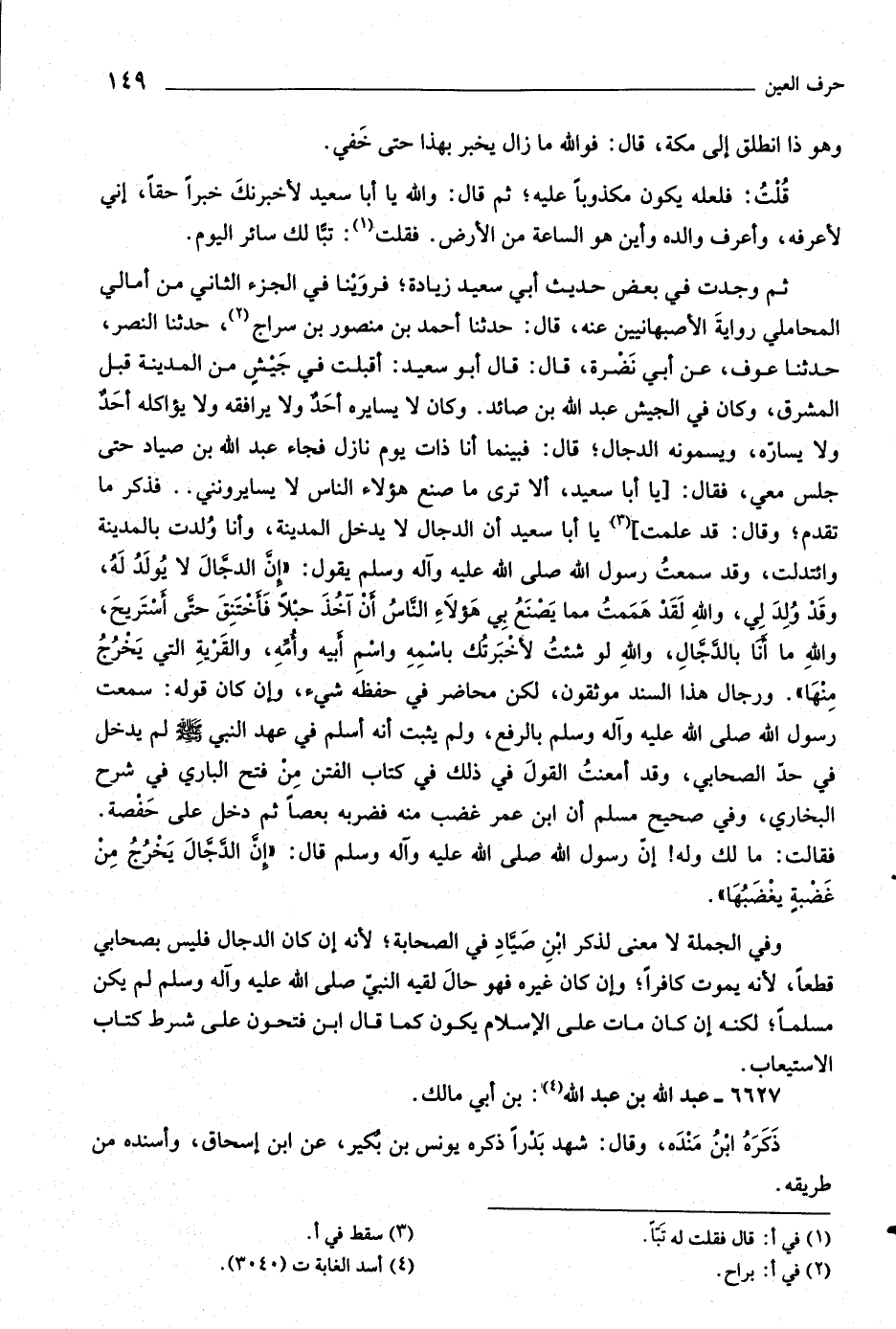 وفي الجملة لا معنى لذكر ابن صيّاد في الصحابة، لأنه إن كان الدجال فليس بصحابي قطعا، لأنه يموت كافرا، وإن كان غيره فهو حال لقيه النبيّ صلّى اللَّه عليه وآله وسلّم لم يكن مسلما، لكنه إن كان مات على الإسلام يكون كما قال ابن فتحون على شرط كتاب الاستيعاب.