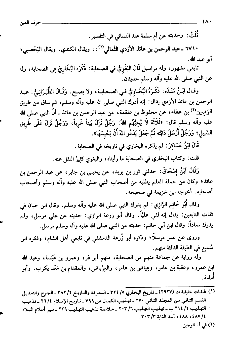 وقال ابن مندة: ذكره البخاريّ في الصحابة، ولا يصح. وقال الطّبرانيّ: عبد الرحمن بن عائذ الأزدي يقال: إنه أدرك النبي صلّى اللَّه عليه وآله وسلم،
