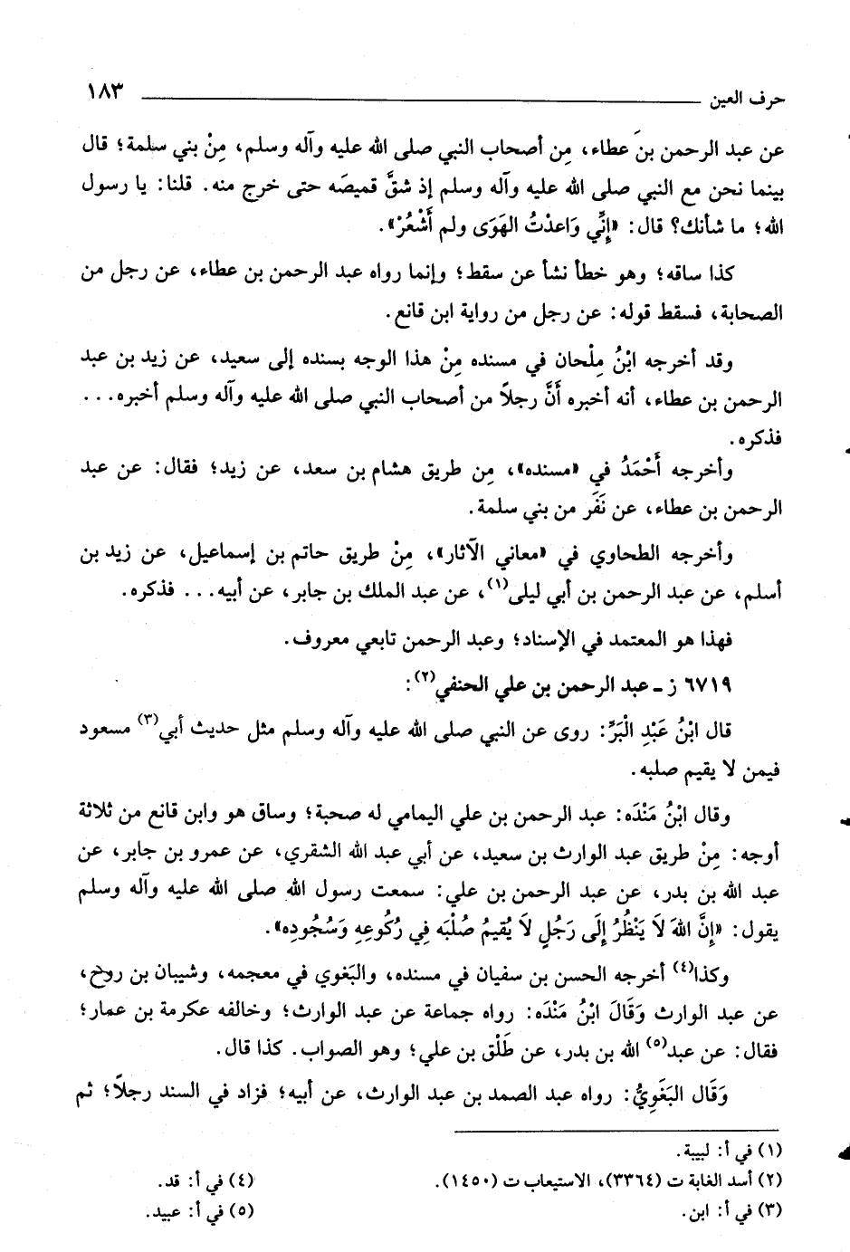 وقال ابن مندة: عبد الرحمن بن علي اليمامي له صحبة، وساق هو وابن قانع من ثلاثة أوجه: من طريق عبد الوارث بن سعيد، عن أبي عبد اللَّه الشقري، عن عمرو بن جابر، عن عبد اللَّه بن بدر، عن عبد الرحمن بن علي: سمعت رسول اللَّه صلّى اللَّه عليه وآله وسلم يقول: «إنّ اللَّه لا ينظر إلى رجل لا يقيم صلبه في ركوعه وسجوده» .