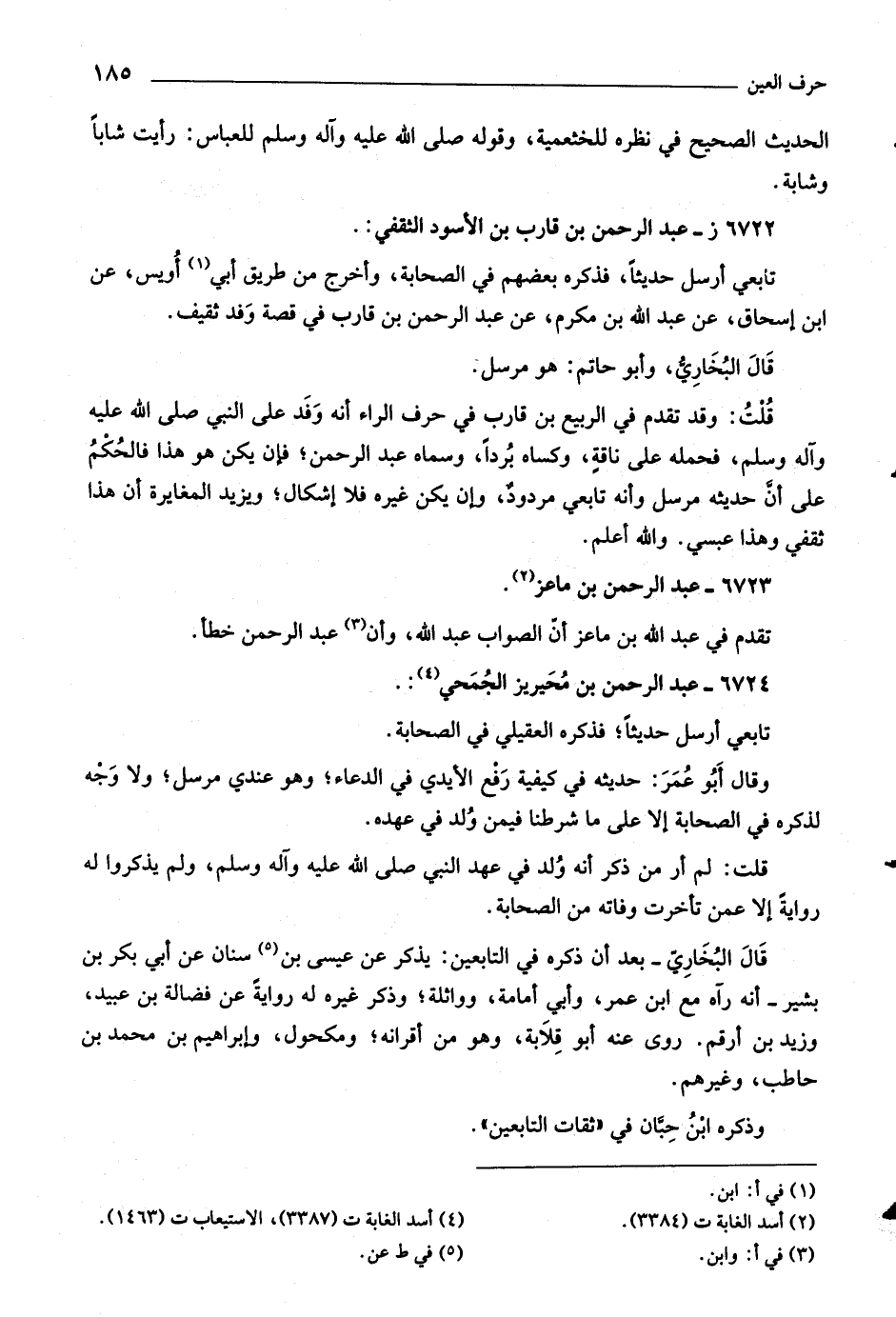 قلت: وقد تقدم في الربيع بن قارب في حرف الراء أنه وفد على النبي صلّى اللَّه عليه وآله وسلم، فحمله على ناقة، وكساه بردا، وسماه عبد الرحمن، فإن يكن هو هذا فالحكم على أنّ حديثه مرسل وأنه تابعي مردود، وإن يكن غيره فلا إشكال، ويزيد المغايرة أن هذا ثقفي وهذا عبسي. واللَّه أعلم.