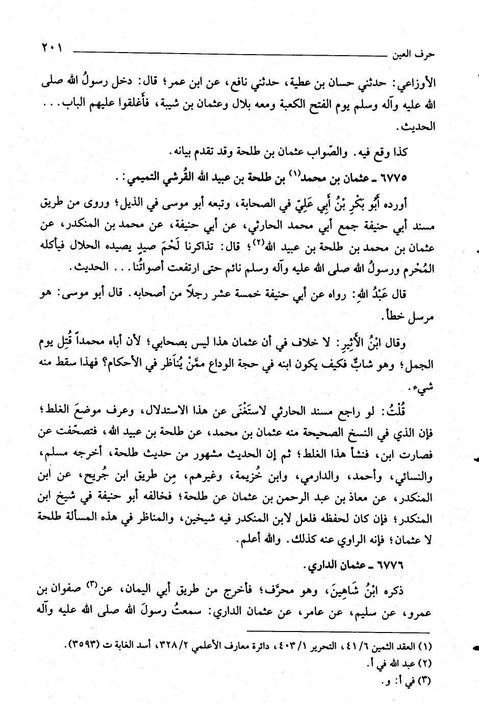 وقال ابن الأثير: لا خلاف في أن عثمان هذا ليس بصحابي، لأن أباه محمدا قتل يوم الجمل، وهو شابّ فكيف يكون ابنه في حجة الوداع ممّن يناظر في الأحكام؟ فهذا سقط منه شيء.