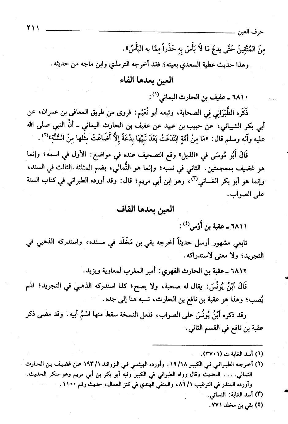 فروى من طريق المعافى بن عمران، عن أبي بكر الشيبانيّ، عن حبيب بن عبيد عن عفيف بن الحارث اليماني- أنّ النبي صلى اللَّه عليه وآله وسلم قال: «ما من أمّة ابتدعت بعد نبيّها بدعة إلّا أضاعت مثلها من السّنّة» «٢» .