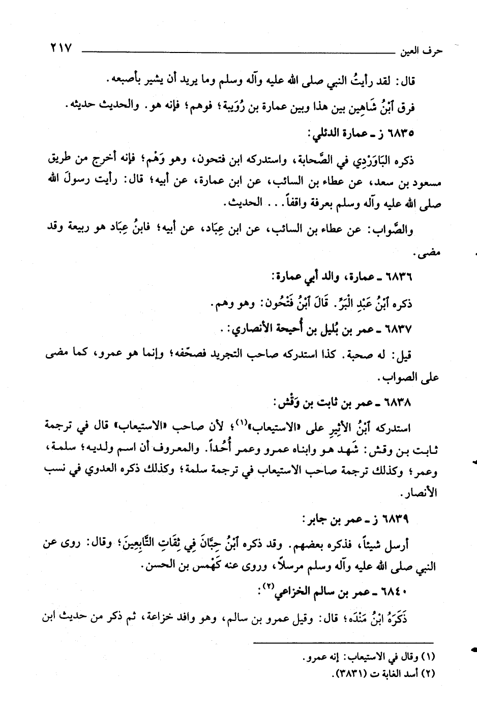 استدركه ابن الأثير على «الاستيعاب» «١» ، لأن صاحب «الاستيعاب» قال في ترجمة ثابت بن وقش: شهد هو وابناه عمرو وعمر أحدا. والمعروف أن اسم ولديه، سلمة، وعمر، وكذلك ترجمة صاحب الاستيعاب في ترجمة سلمة، وكذلك ذكره العدوي في نسب الأنصار.