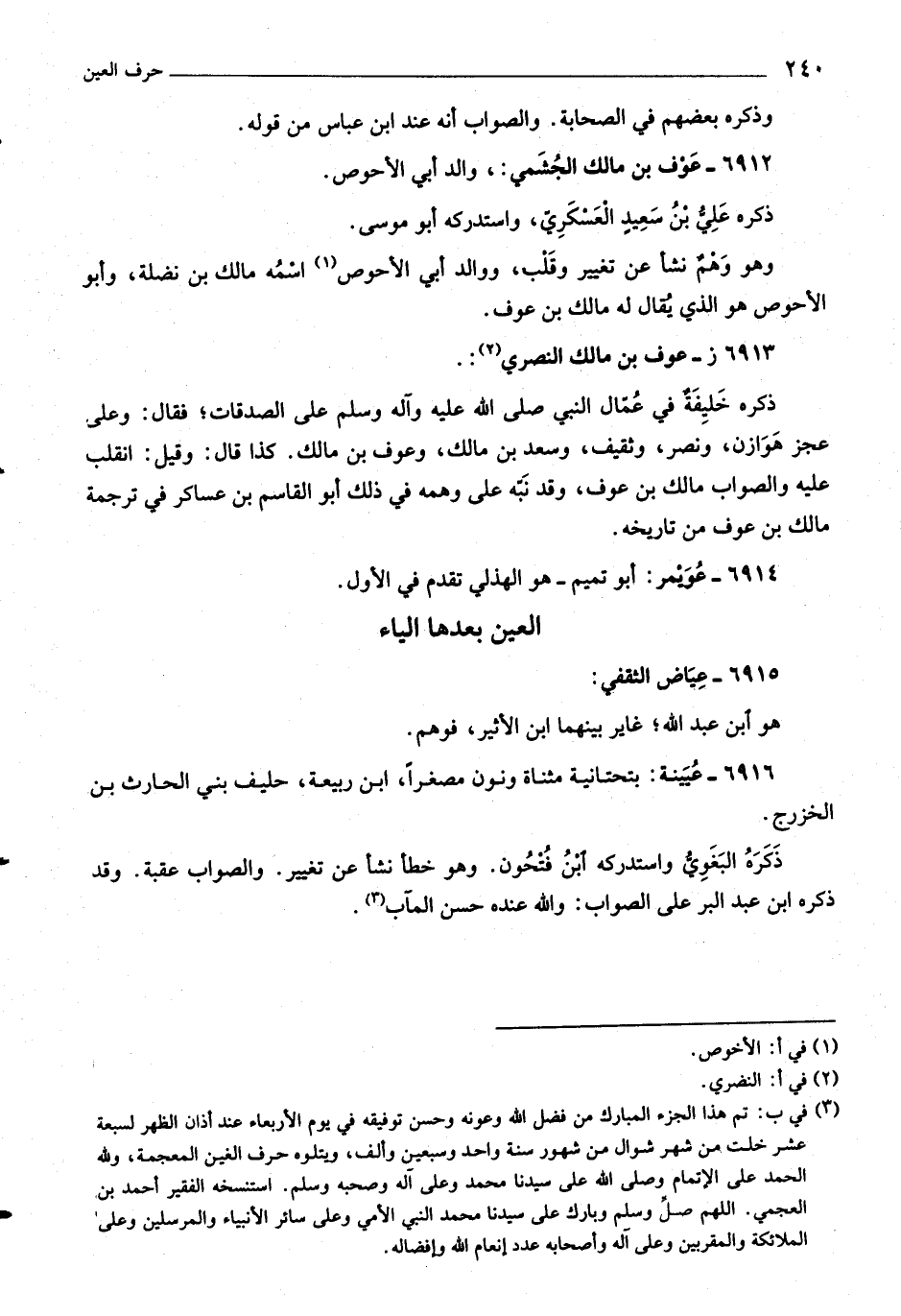(٣) في ب: تم هذا الجزء المبارك من فضل اللَّه وعونه وحسن توفيقه في يوم الأربعاء عند أذان الظهر لسبعة عشر خلت من شهر شوال من شهور سنة واحد وسبعين وألف، ويتلوه حرف الغين المعجمة، وللَّه الحمد على الإتمام وصلّى اللَّه على سيدنا محمد وعلى آله وصحبه وسلم. استنسخه الفقير أحمد بن العجمي. اللَّهمّ صلّ وسلم وبارك على سيدنا محمد النبي الأمي وعلى سائر الأنبياء والمرسلين وعلى الملائكة والمقربين وعلى آله وأصحابه عدد إنعام اللَّه وإفضاله.