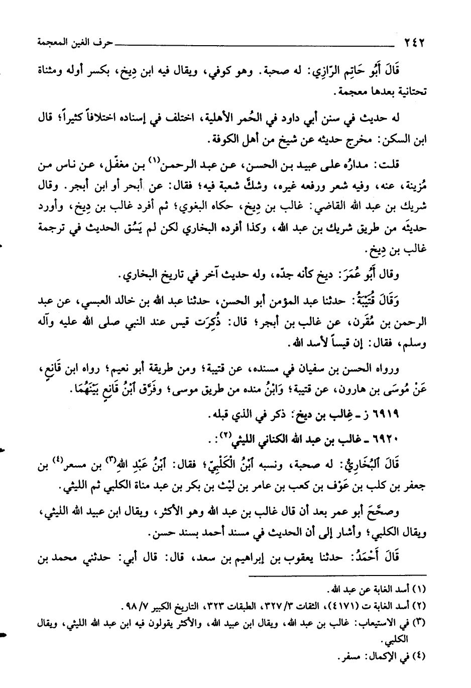 وصحّح أبو عمر بعد أن قال غالب بن عبد اللَّه وهو الأكثر، ويقال ابن عبيد اللَّه الليثي، ويقال الكلبي، وأشار إلى أن الحديث في مسند أحمد بسند حسن.