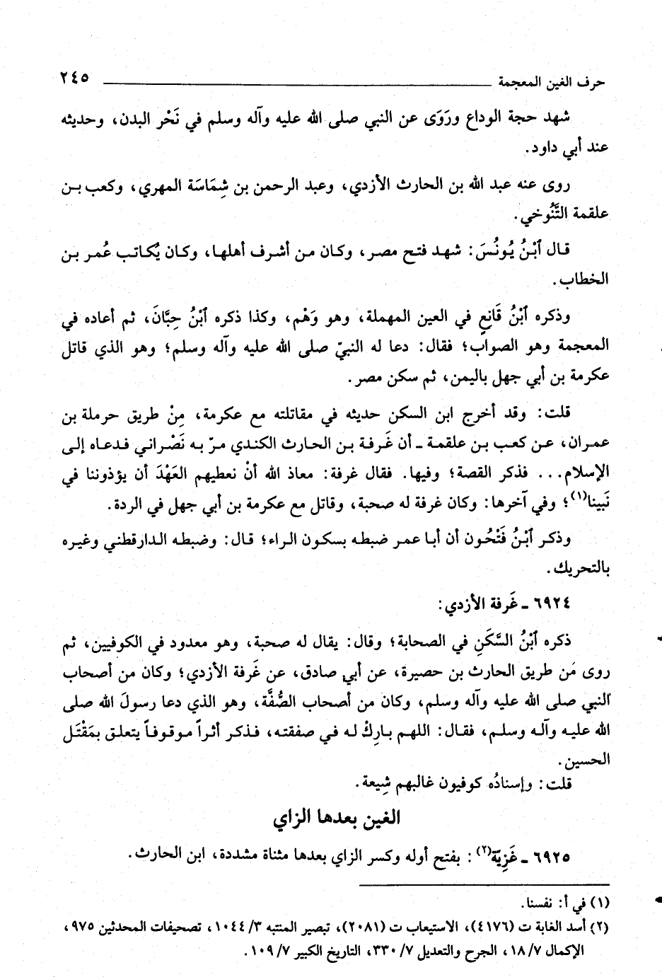 (٢) أسد الغابة ت (٤١٧٦) ، الاستيعاب ت (٢٠٨١) ، تبصير المنتبه ٣/ ١٠٤٤، تصحيفات المحدثين ٩٧٥، الإكمال ٧/ ١٨، الجرح والتعديل ٧/ ٣٣٠، التاريخ الكبير ٧/ ١٠٩.