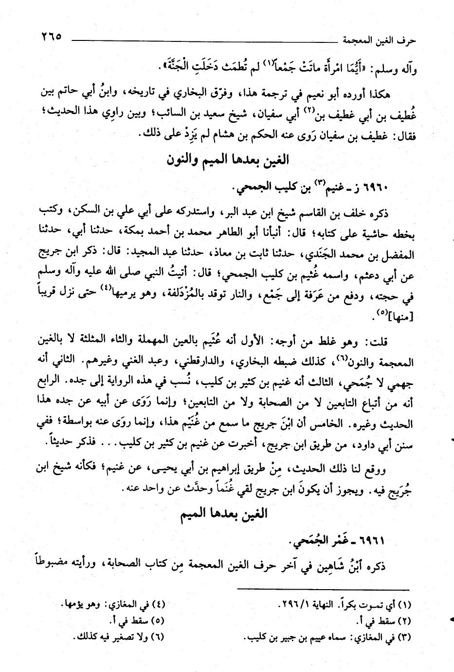 قلت: وهو غلط من أوجه: الأول أنه عثيم بالعين المهملة والثاء المثلثة لا بالغين المعجمة والنون «٦» ، كذلك ضبطه البخاري، والدار الدّارقطنيّ، وعبد الغني وغيرهم. الثاني أنه جهمي لا جمحي، الثالث أنه غنيم بن كثير بن كليب، نسب في هذه الرواية إلى جده. الرابع أنه من أتباع التابعين لا من الصحابة ولا من التابعين، وإنما روى عن أبيه عن جده هذا الحديث وغيره. الخامس أن ابن جريج ما سمع من غنيم هذا، وإنما روى عنه بواسطة، ففي سنن أبي داود، من طريق ابن جريج، أخبرت عن غنيم بن كثير بن كليب ... فذكر حديثا.