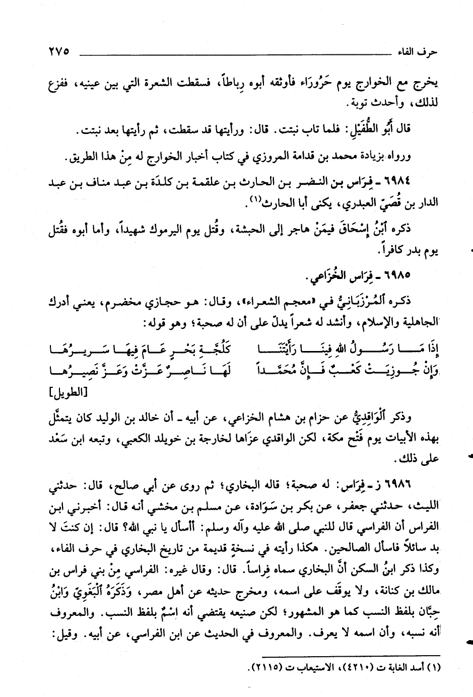 هكذا رأيته في نسخة قديمة من تاريخ البخاري في حرف الفاء، وكذا ذكر ابن السكن أنّ البخاري سماه فراسا. قال: وقال غيره: الفراسي من بني فراس بن مالك بن كنانة، ولا يوقف على اسمه، ومخرج حديثه عن أهل مصر، وذكره البغويّ وابن حبّان بلفظ النسب كما هو المشهور، لكن صنيعه يقتضي أنه اسم بلفظ النسب. والمعروف أنه نسبه، وأن اسمه لا يعرف. والمعروف في الحديث عن ابن الفراسي، عن أبيه. وقيل: