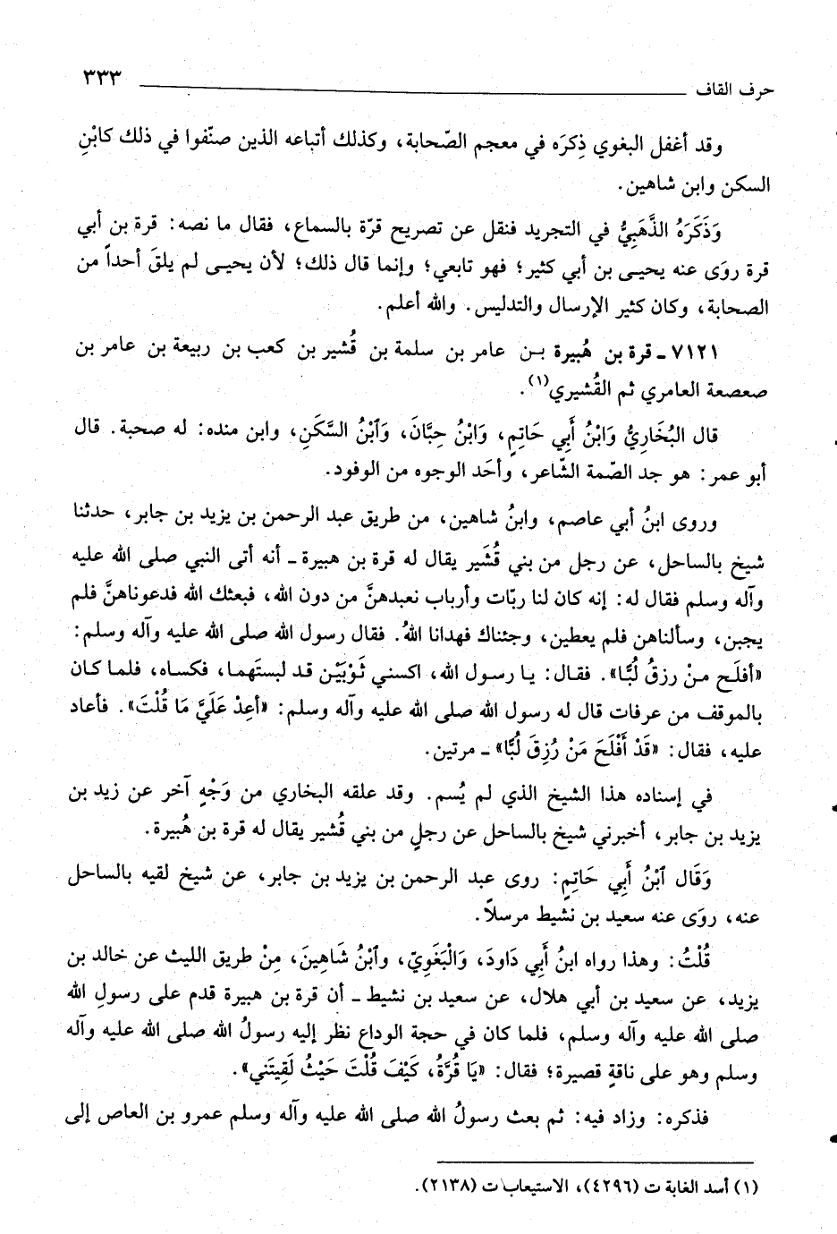 وروى ابن أبي عاصم، وابن شاهين، من طريق عبد الرحمن بن يزيد بن جابر، حدثنا شيخ بالساحل، عن رجل من بني قشير يقال له قرة بن هبيرة- أنه أتى النبي صلّى اللَّه عليه وآله وسلم فقال له: إنه كان لنا ربّات وأرباب نعبدهنّ من دون اللَّه، فبعثك اللَّه فدعوناهنّ فلم يجبن، وسألناهن فلم يعطين، وجئناك فهدانا اللَّه. فقال رسول اللَّه صلّى اللَّه عليه وآله وسلم: