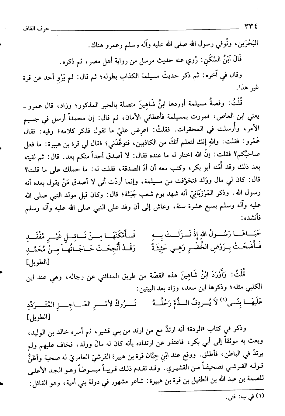 [الطويل] وذكر في كتاب «الردة» أنه ارتدّ مع من ارتد من بني قشير، ثم أسره خالد بن الوليد، وبعث به موثقا إلى أبي بكر، فاعتذر عن ارتداده بأنه كان له مال وولد، فخاف عليهم ولم يرتدّ في الباطن، فأطلق. ووقع عند ابن حبّان قرة بن هبيرة القرشيّ العامريّ له صحبة وأظنّ قوله القرشي تصحيفا من القشيري. وقد تقدم ذلك قريبا مبسوطا وهو الجد الأعلى للصمة بن عبد اللَّه بن الطفيل بن قرة بن هبيرة: شاعر مشهور في دولة بني أمية، وهو القائل:
