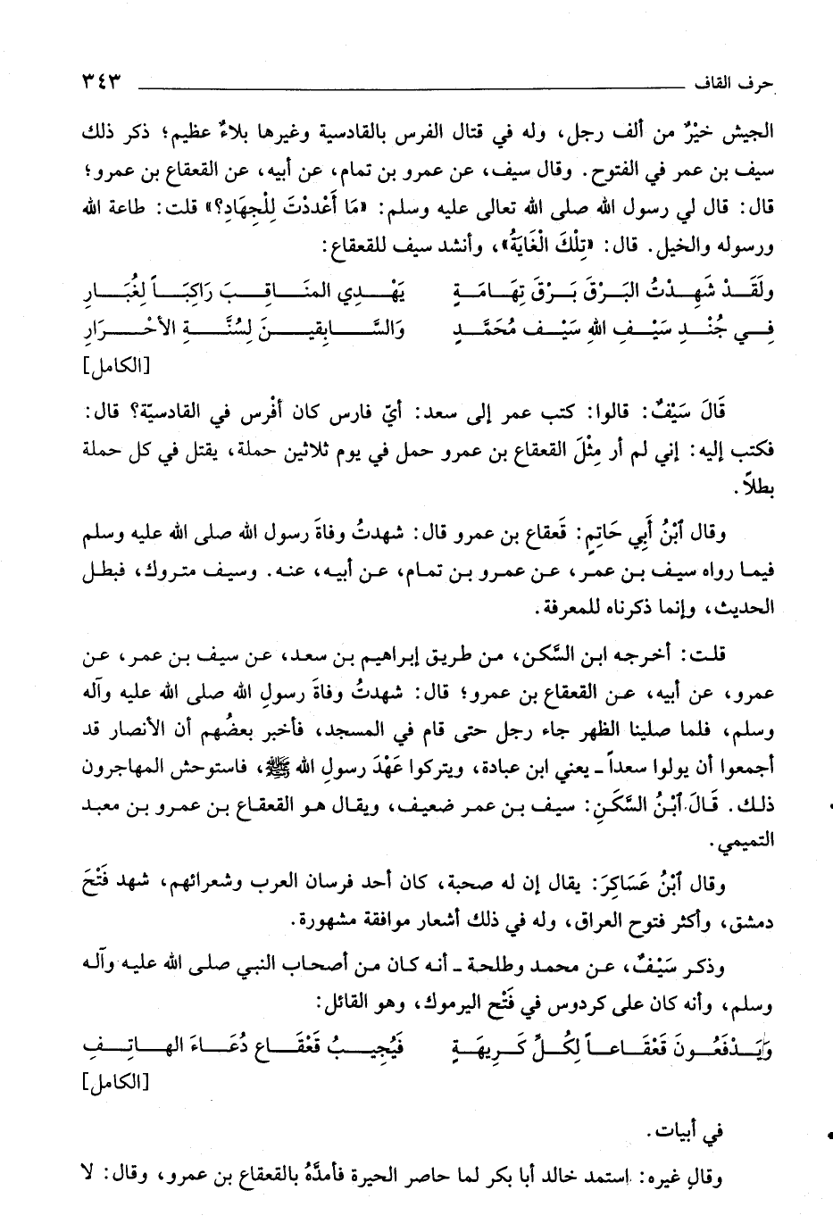 وقال سيف، عن عمرو بن تمام، عن أبيه، عن القعقاع بن عمرو، قال: قال لي رسول اللَّه صلّى اللَّه تعالى عليه وآله وسلم: «ما أعددت للجهاد؟» قلت: طاعة اللَّه ورسوله والخيل. قال: «تلك الغاية» ،