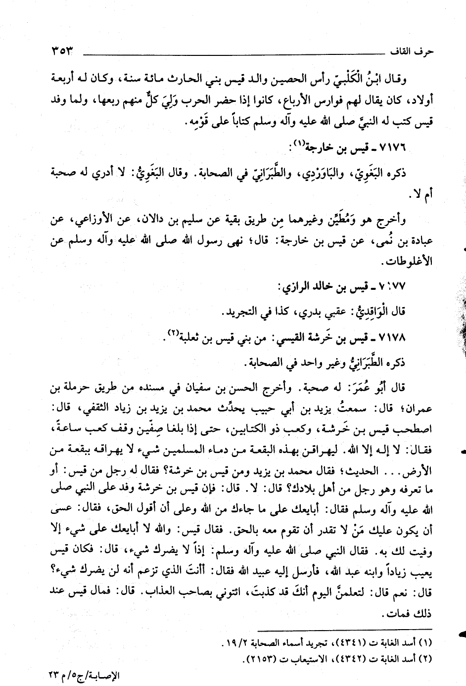 وأخرج الحسن بن سفيان في مسندة من طريق حرملة بن عمران، قال: سمعت يزيد بن أبي حبيب يحدّث محمد بن يزيد بن زياد الثقفي، قال: اصطحب قيس بن خرشة، وكعب ذو الكتابين، حتى إذا بلغا صفّين وقف كعب ساعة، فقال: لا إله إلا اللَّه. ليهراقن بهذه البقعة من دماء المسلمين شيء لا يهراقه ببقعة من الأرض ... الحديث، فقال محمد بن يزيد ومن قيس بن خرشة؟ فقال له رجل من قيس: أو ما تعرفه وهو رجل من أهل بلادك؟ قال: لا. قال: فإن قيس بن خرشة وفد على النبي صلّى اللَّه عليه وآله وسلم فقال: أبايعك على ما جاءك من اللَّه وعلى أن أقول الحق، فقال: عسى أن يكون عليك من لا تقدر أن تقوم معه بالحق. فقال قيس: واللَّه لا أبايعك على شيء إلا وفيت لك به. فقال النبي صلّى اللَّه عليه وآله وسلم: إذا لا يضرك شيء،