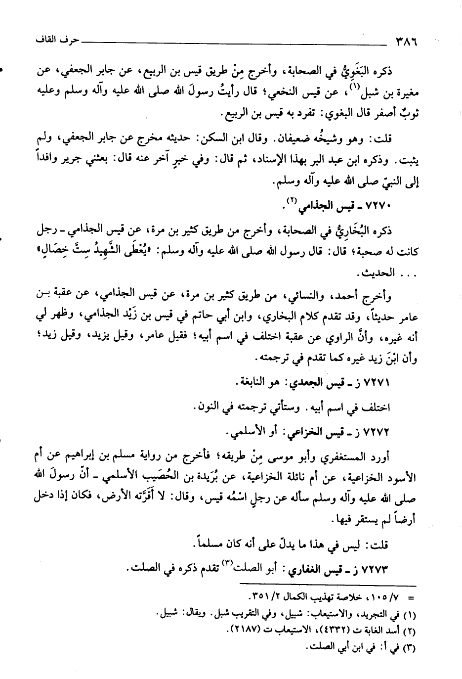 وأخرج من طريق كثير بن مرة، عن قيس الجذامي- رجل كانت له صحبة، قال: قال رسول اللَّه صلّى اللَّه عليه وآله وسلم: «يعطى الشّهيد ستّ خصال» ... الحديث.
