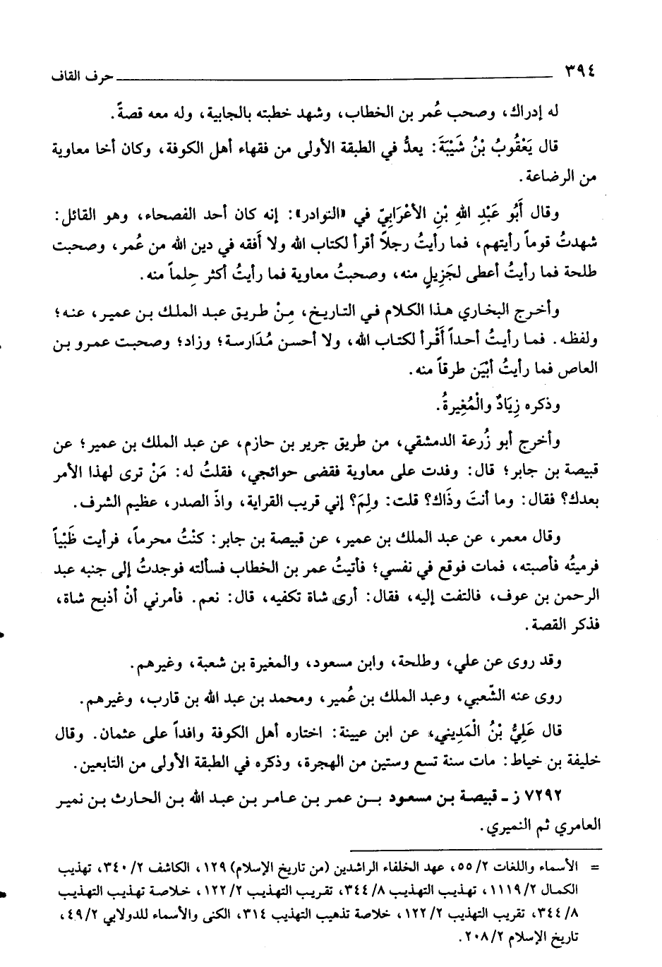 وأخرج أبو زرعة الدمشقيّ، من طريق جرير بن حازم، عن عبد الملك بن عمير، عن قبيصة بن جابر، قال: وفدت على معاوية فقضى حوائجي، فقلت له: من ترى لهذا الأمر بعدك؟ فقال: وما أنت وذاك؟ قلت: ولم؟ إني قريب القرابة، واذّ الصدر، عظيم الشرف.