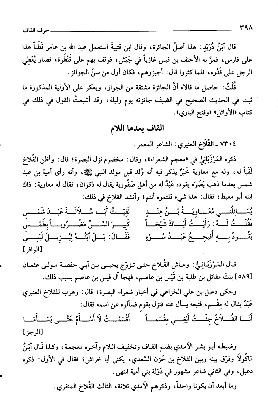 [الرجز] وضبطه أبو بشر الآمدي بضم القاف وتخفيف اللام وآخره معجمة، وكذا قال ابن ماكولا وفرّق بينه وبين القلاخ بن حزن السّعديّ، يكنى أبا خراش، فقال في الأول: ذكره دعبل، وفي الثاني شاعر مشهور في دولة بني أمية انتهى.
