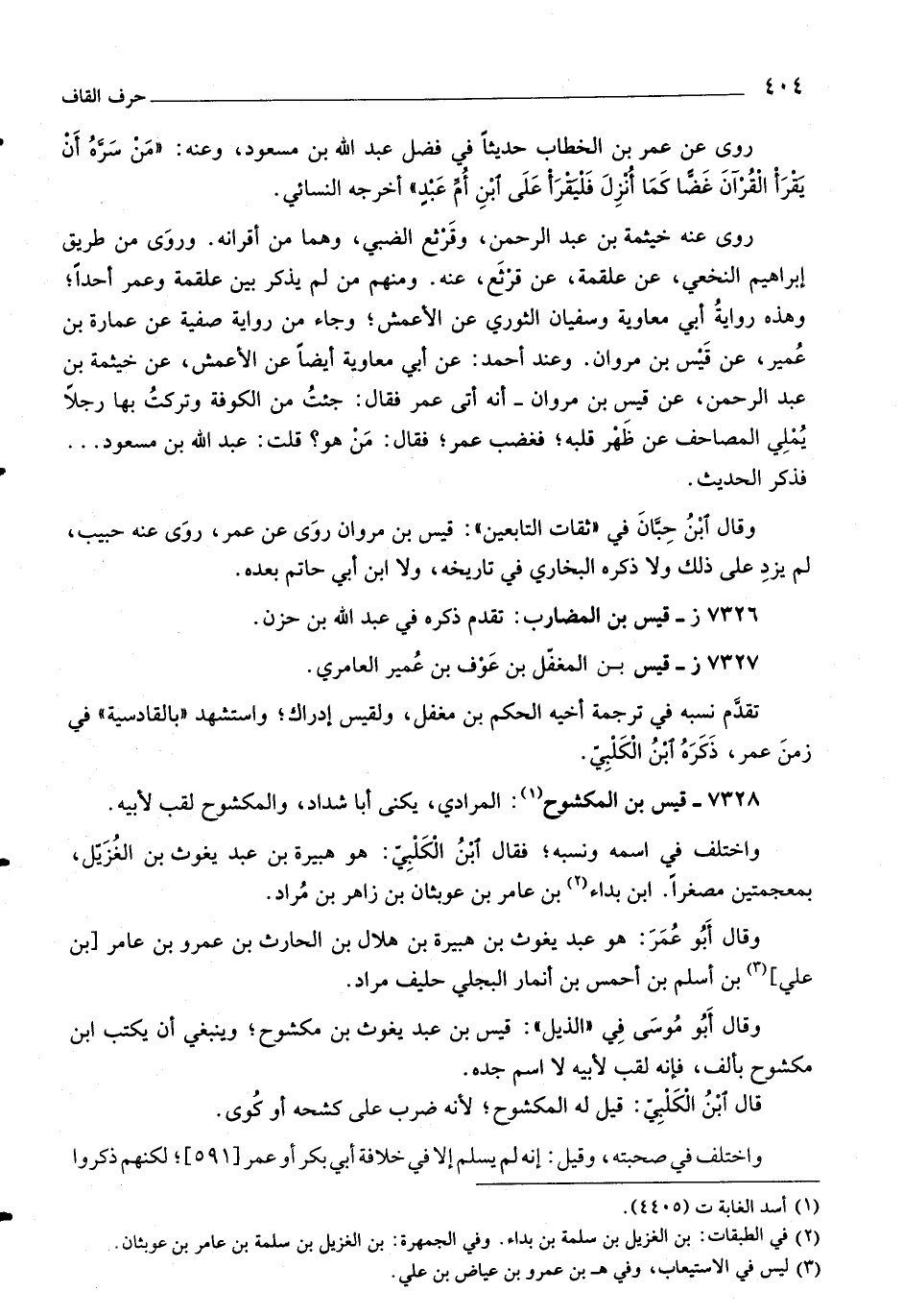 روى عنه خيثمة بن عبد الرحمن، وقرثع الضبي، وهما من أقرانه. وروى من طريق إبراهيم النخعي، عن علقمة، عن قرثع، عنه. ومنهم من لم يذكر بين علقمة وعمر أحدا، وهذه رواية أبي معاوية وسفيان الثوري عن الأعمش، وجاء من رواية صفية عن عمارة بن عمير، عن قيس بن مروان. وعند أحمد: عن أبي معاوية أيضا عن الأعمش، عن خيثمة بن عبد الرحمن، عن قيس بن مروان- أنه أتى عمر فقال: جئت من الكوفة وتركت بها رجلا يملي المصاحف عن ظهر قلبه، فغضب عمر، فقال: من هو؟ قلت: عبد اللَّه بن مسعود ...