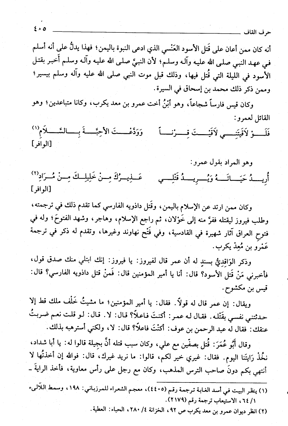 [الوافر] وكان ممن ارتد عن الإسلام باليمن، وقتل داذويه الفارسيّ كما تقدم ذلك في ترجمته، وطلب فيروز ليقتله ففرّ منه إلى خولان، ثم راجع الإسلام، وهاجر، وشهد الفتوح، وله في فتوح العراق آثار شهيرة في القادسية، وفي فتح نهاوند وغيرها، وتقدم له ذكر في ترجمة عمرو بن معديكرب.